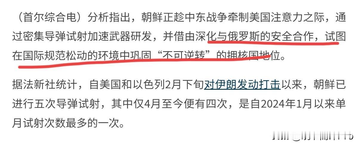 朝鲜的忧患意识是真强!不给美国一点可趁之机,趁着美国陷在中东,朝鲜抓紧时间提升威慑能力!4月27日,根据联合早报报道,联合早报表示,朝鲜近期导弹试射频次明显增加,4月发射次数创两年多来新高。联合早报援引分析人士观点认为,平壤正利用中东战事分散美国注意力,加速武器研发,以确保自身国家安全。 联合早报表示,自美国和以色列2月下旬对伊朗发动打击以来,朝鲜已进行五次导弹试射,其中仅4月至今便有四次,是自2024年1月以来单月试射次数最多的一次。全球安全格局正趋于无序,既有国际规范不再有效发挥作用。朝鲜正利用这一战略空档,推动完成核武库建设。朝鲜的判断是,这是加速进攻性威慑、同步发展核力量和常规力量的最佳时机。 从外媒这一分析来看,不得不说,朝鲜的忧患意识是真强。世界局势不太平,美国越来越成为全球不稳定因素,显然朝鲜非常清楚自身所处的地缘环境很严峻。因此,为了把握主动,就必须未雨绸缪。说实话,美国之所以敢贸然出兵伊朗,不就是把伊朗当软柿子捏吗?显然,今天美国对委内瑞拉,伊朗下手,明天美国未必不会对朝鲜有非分之想。 趁着美国抽不开身,让美国意识到朝鲜是一块难啃的骨头,才会让美国彻底的死心。在弱肉强食的丛林法则下,空谈安全没有任何意义,唯有手握硬实力,才能守住国家主权与生存底线。朝鲜对美国,日本,甚至包括韩国都不会有幻想。从时机把握来说,朝鲜卡的非常的精准。相信朝鲜的动作,也会让美国感到投鼠忌器。