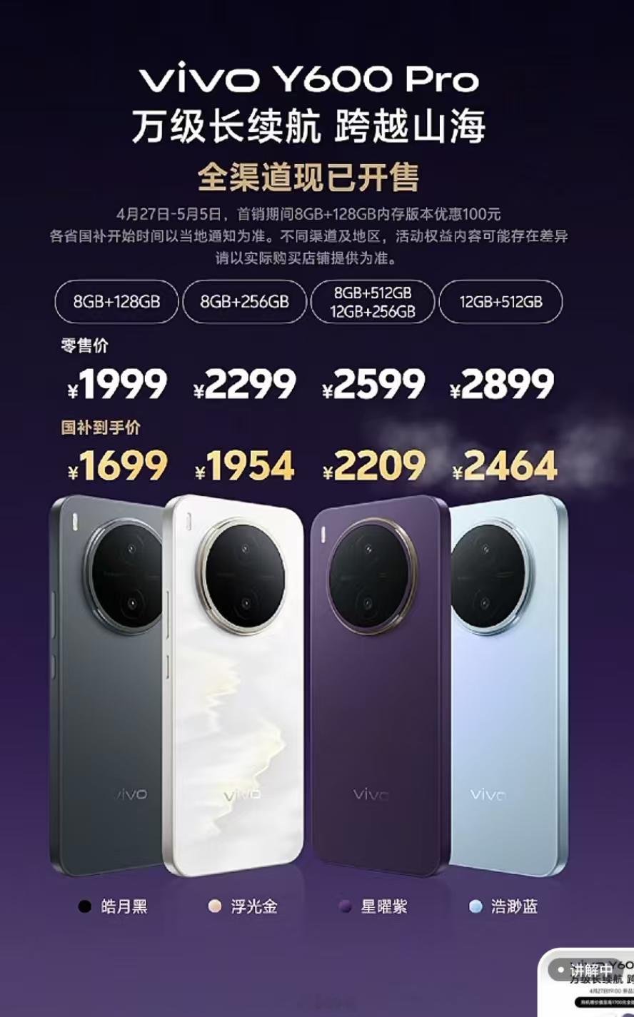 vivoY600Pro价格来了:8+128G 1999元8+256G 2299元8+512G/12+256G 2599元12+512G 2899元