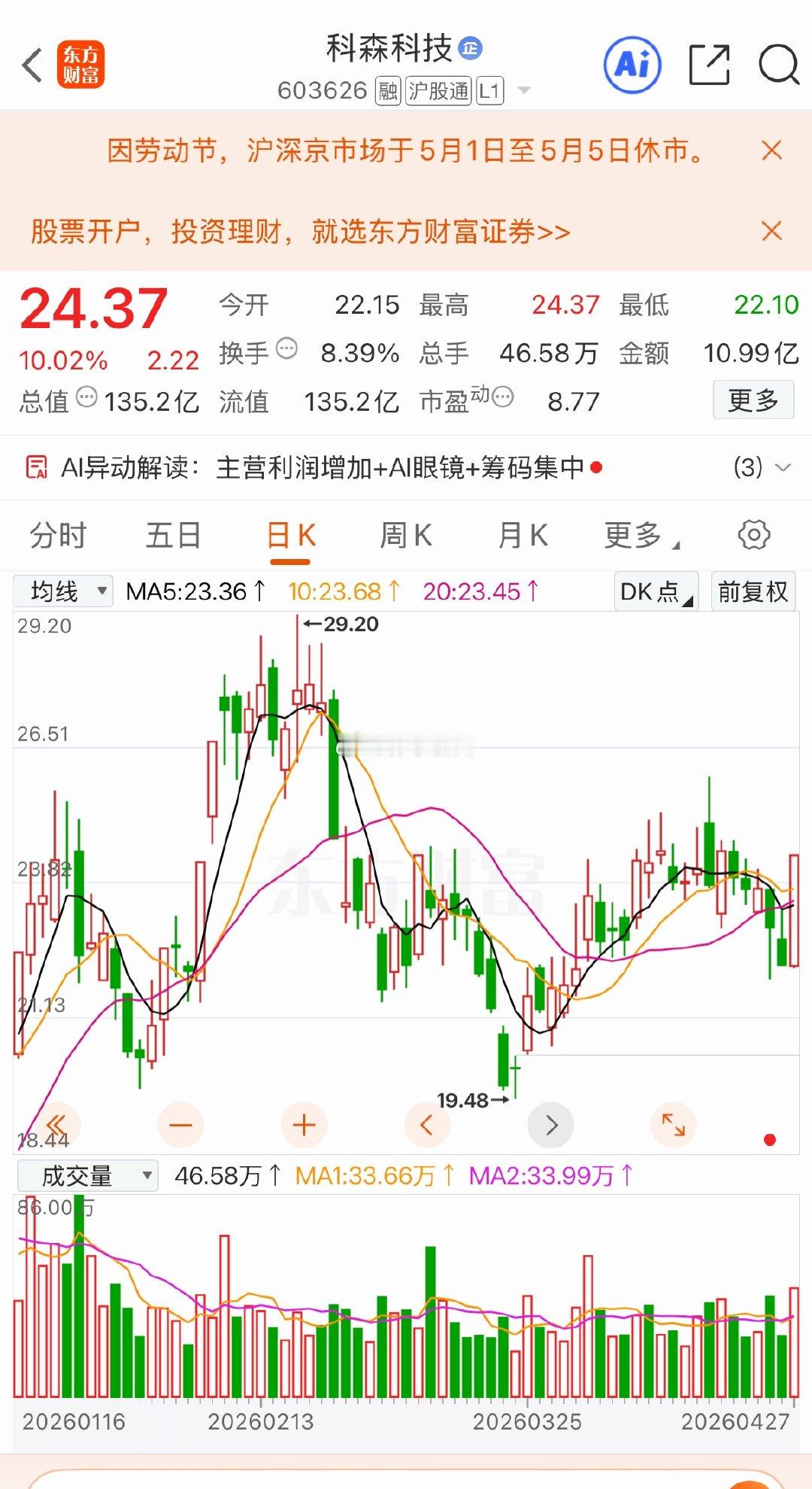 4月26日。星期天。沪深热门股票。泰嘉股份。近期有量。震荡向上。蓝色光标。