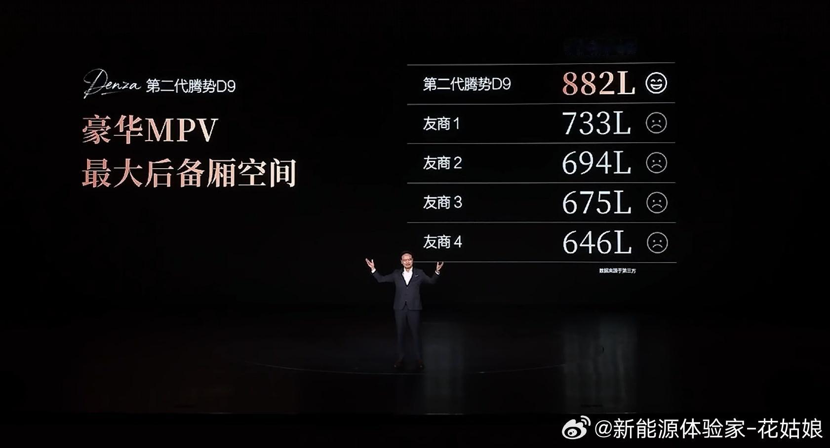2. 车尾空间直接被“解放”,腾出来的每一寸地方,都是你实打实能用的储物空间! 882L后备箱是什么概念?同级别豪华MPV还在700L上下徘徊的时候,第二代腾势D9直接干到了882L,是真正的断层领先!7人满载状态下,仍可放下12个行李箱,全家出行再也不用为行李位发愁;