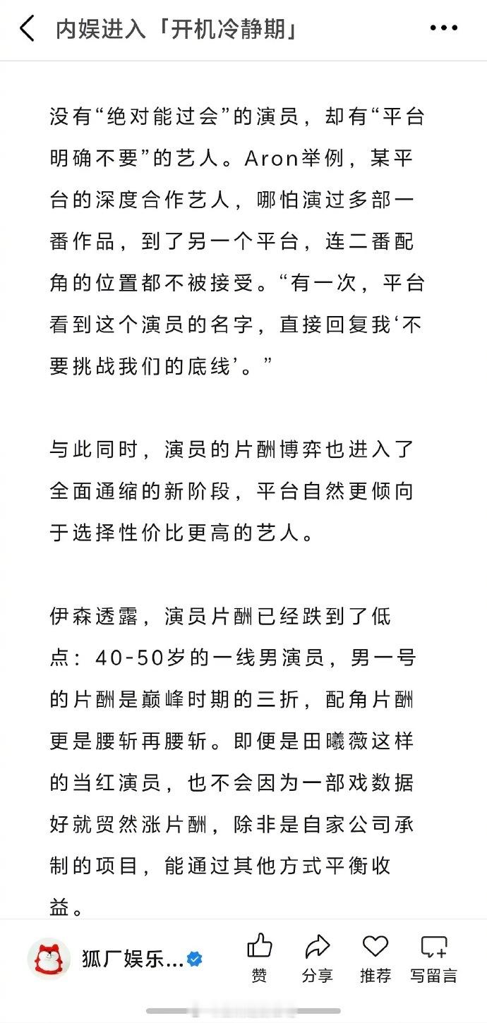 2.演员片酬已经跌到低点,40-50岁的一线演员,男一号的片酬是巅峰的三折;