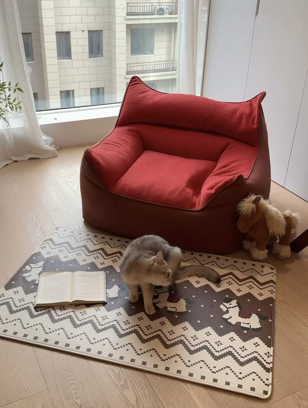 平时我总把它换着位置用:放在餐边柜咖啡机下,溅出的咖啡液一擦即净,保护地板还让区域更整洁;挪到阳台单人沙发旁,光脚踩着晒太阳、看书,仪式感拉满;偶尔放厨房门口,阻隔水渍油污也很合适。