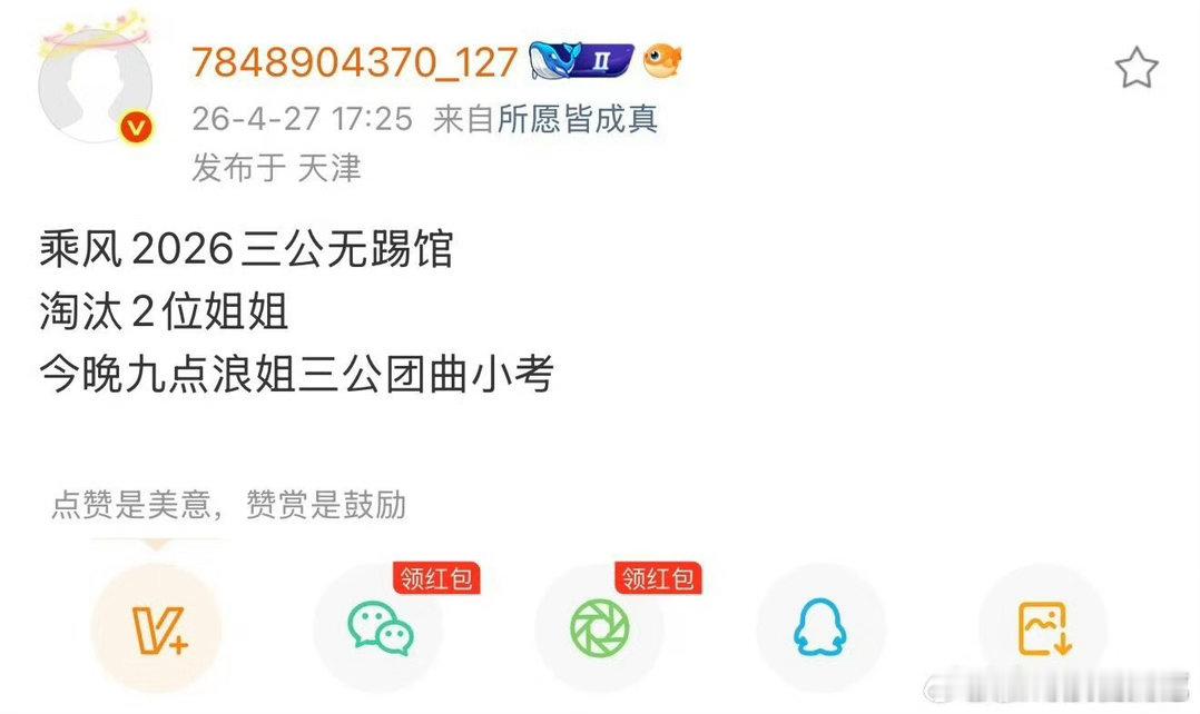 浪姐四公 无踢馆网传浪姐四公没有踢馆, 这样姐姐们也没那么大压力了,这样的赛制感觉安稳多了,姐姐们可以享受享受舞台了~乘风2026