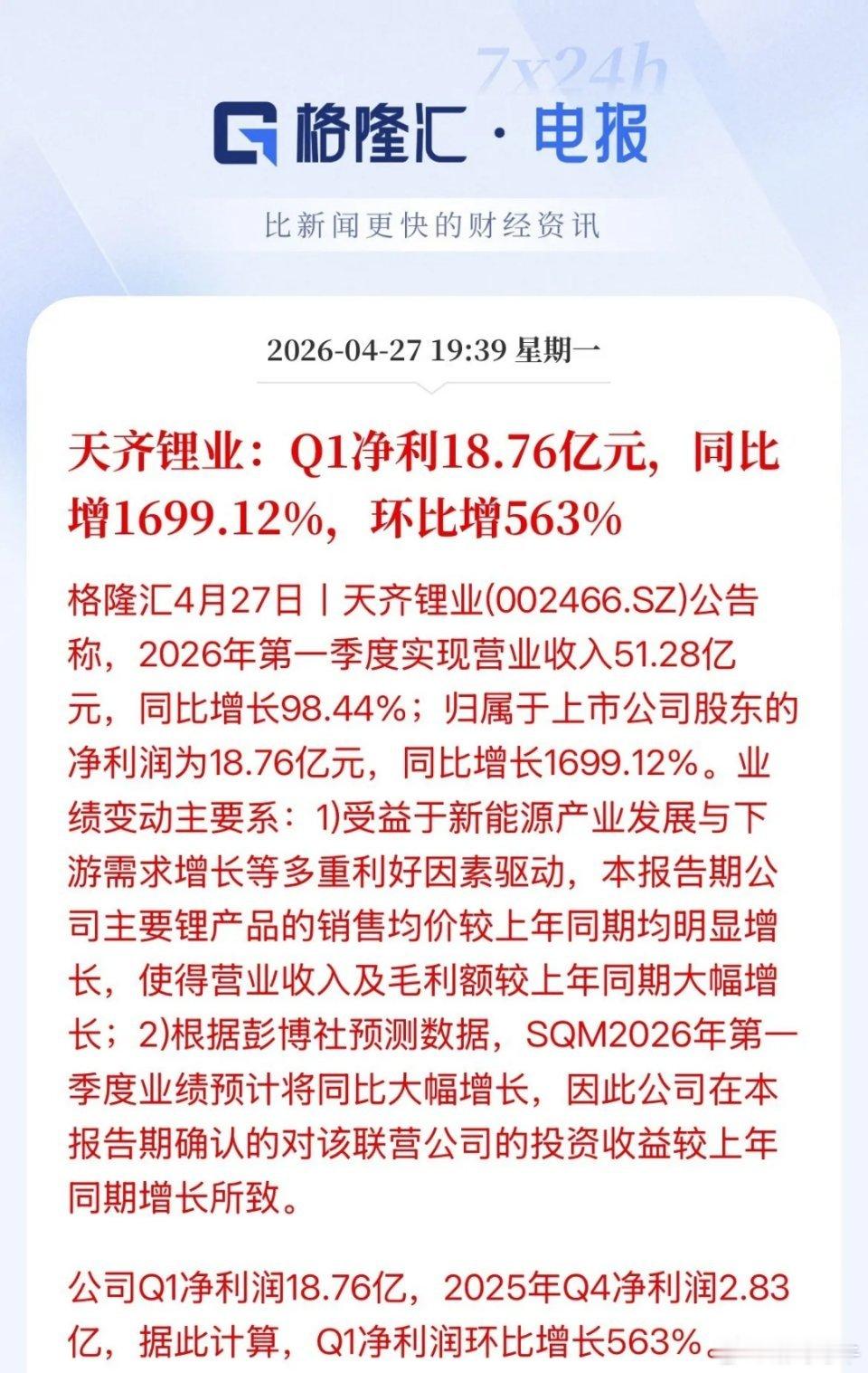 锂矿概念大爆不是没有原因!大赚啊,超预期,天齐锂业一季度业净利润暴涨16倍,营收同比增长98%,锂矿大涨的确定性下,营收和净利润双双强劲表现