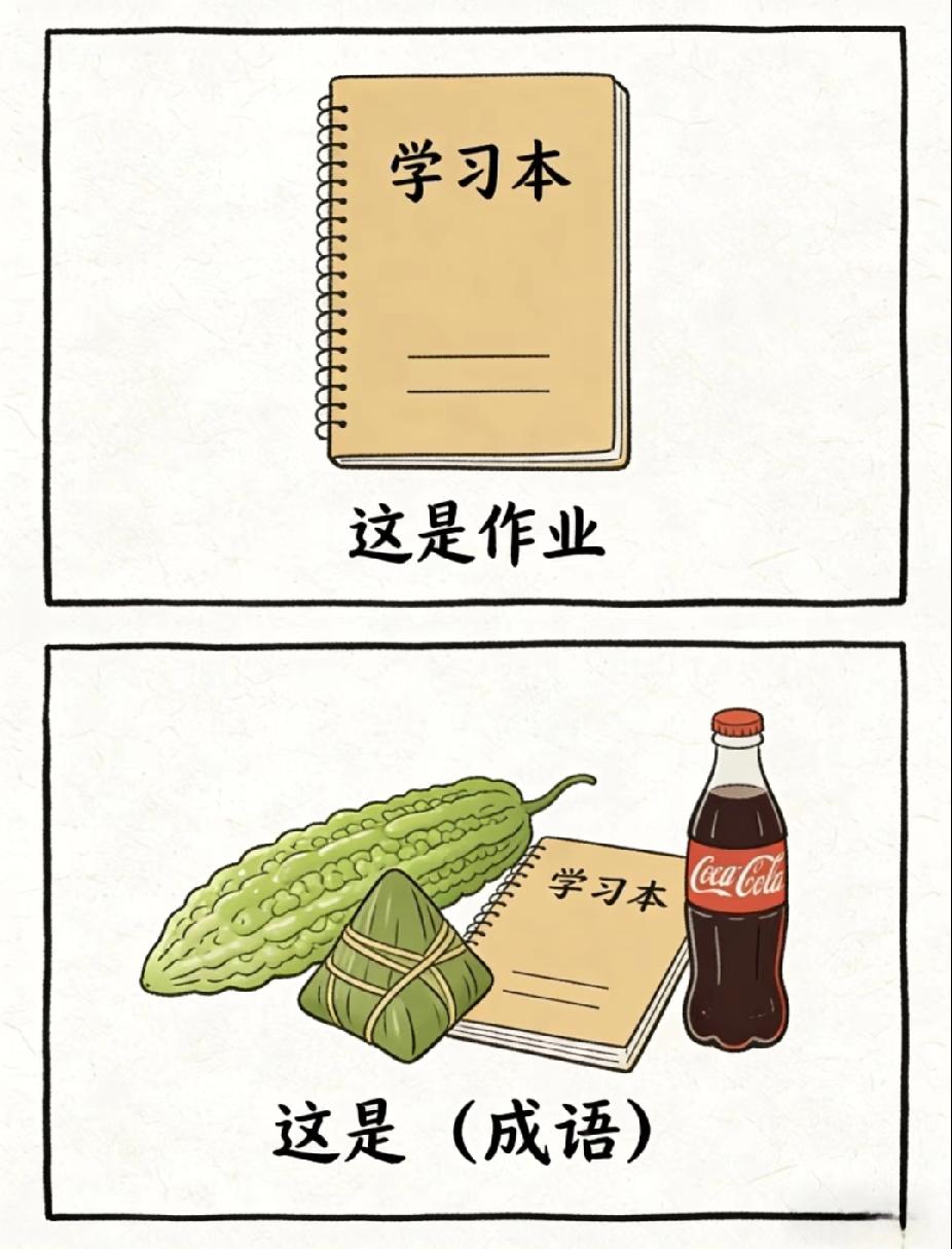 作业+苦瓜+粽子+可乐,藏着什么成语?