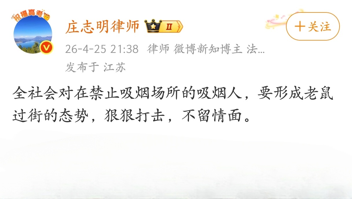 庄志明律师:全社会对在禁止吸烟场所的吸烟人,要形成老鼠过街的态势,狠狠打击,不留情面。