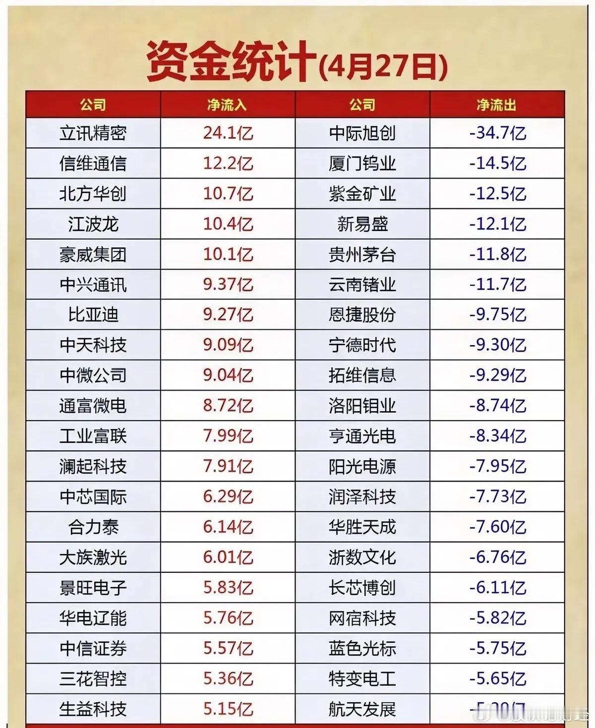 “4月27日净流入与净流出前20名股票,立讯精密领跑!”📈💰4月27日立