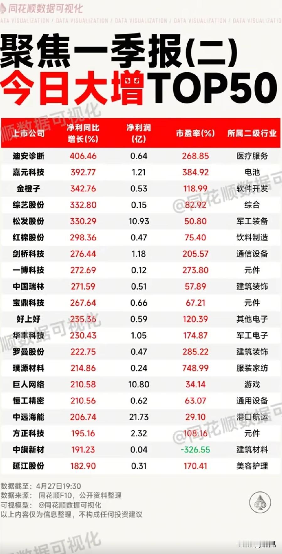 净利最高涨406%!一季报翻倍牛股全盘点! 本次梳理为A股一季报净利同比增幅TOP个股榜单,增幅区间182.90%-406.46%,覆盖医疗服务、电池、军工、港口航运等多赛道。标的盈利与估值分化显著,既有净利超20亿的龙头,也有净利不足千万的标的,业绩增长核心来自行业景气、消费复苏与低基数修复三类驱动。 个股梳理分析 1. 迪安诊断,医疗服务行业,一季报净利0.64亿元,同比增406.46%,市盈率268.85倍。受益于IVD诊断业务回暖,下游医院检测需求恢复,盈利大幅提升。 2. 嘉元科技,电池行业,一季报净利1.21亿元,同比增392.77%,市盈率384.92倍。锂电铜箔需求随新能源扩产复苏,订单提升带动产能利用率与盈利同步增长。 3. 金橙子,软件开发行业,一季报净利0.53亿元,同比增342.76%,市盈率118.99倍。工业控制软件及激光设备配套订单放量,制造业自动化升级带动业务增长。 4. 综艺股份,综合行业,一季报净利0.15亿元,同比增332.80%,市盈率82.92倍。业务结构优化叠加低基数,项目收益与主业改善共同推高增幅。 5. 松发股份,军工装备行业,一季报净利10.93亿元,同比增330.29%,市盈率50.80倍。军工陶瓷配套订单爆发,盈利规模大幅提升,估值处于行业合理区间。 6. 红棉股份,饮料制造行业,一季报净利0.47亿元,同比增298.36%,市盈率75.40倍。饮料消费市场回暖,产品结构升级带动毛利率提升,盈利快速修复。 7. 剑桥科技,通信设备行业,一季报净利1.18亿元,同比增276.44%,市盈率205.57倍。AI算力需求带动光模块海外订单增长,通信设备业务盈利大幅改善。 8. 一博科技,元件行业,一季报净利0.12亿元,同比增272.69%,市盈率273.80倍。PCB配套设计服务需求回升,低基数放大业绩增幅,盈利实现边际改善。 9. 中国瑞林,建筑装饰行业,一季报净利0.51亿元,同比增271.59%,市盈率57.89倍。金属矿山工程订单释放,矿业技术服务业务盈利改善,带动业绩增长。 10. 宝鼎科技,元件行业,一季报净利0.66亿元,同比增267.64%,市盈率67.21倍。精密铸件业务需求回暖,工业及军工配套订单提升,带动盈利规模增长。 11. 好上好,其他电子行业,一季报净利0.59亿元,同比增235.36%,市盈率120.39倍。电子元器件分销业务随消费电子复苏回暖,下游订单增长带动盈利提升。 12. 华丰科技,军工电子行业,一季报净利1.05亿元,同比增230.43%,市盈率174.87倍。军工连接器订单随国防信息化建设增长,配套业务盈利大幅改善。 13. 罗曼股份,建筑装饰行业,一季报净利0.47亿元,同比增222.75%,市盈率285.22倍。文旅照明项目集中落地,叠加低基数影响,带动业绩大幅增长。 14. 璞源材料,服装家纺行业,一季报净利0.24亿元,同比增214.86%,市盈率748.99倍。家纺面料海外出口需求改善,订单回暖带动盈利修复,估值处于高位。 15. 巨人网络,游戏行业,一季报净利10.80亿元,同比增210.58%,市盈率34.14倍。游戏产品流水回升,新老项目共同贡献收入,盈利规模稳定,估值偏低。 16. 恒工精密,通用设备行业,一季报净利0.62亿元,同比增210.56%,市盈率63.07倍。精密铸件需求随新能源及工业客户复苏增长,订单放量带动盈利提升。 17. 中远海能,港口航运行业,一季报净利21.73亿元,同比增206.74%,市盈率29.10倍。油运行业景气度上行,运价维持高位,带动盈利大幅增长,估值合理。 18. 方正科技,元件行业,一季报净利2.32亿元,同比增195.16%,市盈率108.16倍。PCB业务盈利修复,下游通信及消费电子需求回暖,带动产能利用率提升。 19. 中旗新材,建筑材料行业,一季报净利0.04亿元,同比增191.23%,市盈率-326.55倍。有机硅材料业务边际改善,此前亏损致市盈率为负,盈利小幅修复。 20. 延江股份,美容护理行业,一季报净利0.31亿元,同比增182.90%,市盈率170.41倍。无纺布及卫生材料订单回暖,低基数带动业绩实现大幅增长。 总结 本次上榜个股增长驱动多元:油运、军工、AI通信等赛道标的依托行业红利稳定盈利;消费相关标的受益复苏实现修复;部分标的靠低基数扭亏达成高增幅。龙头标的盈利确定性更强,中小市值标的持续性有待验证,整体反映A股多赛道复苏格局。 本文涉及资讯内容来自网络公共信息,仅供参考不构成投资建议!