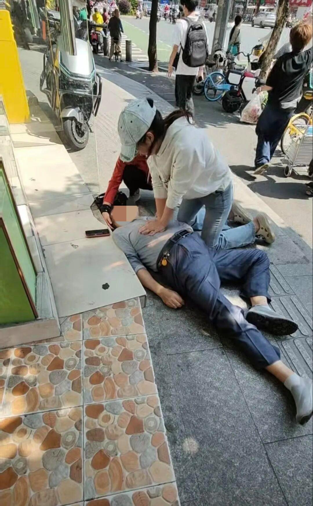 “1、2、3……”每一次按压都深而有力,膝盖传来阵阵钝痛,她却浑然不觉。眼见黄思婷连续实施多轮复苏,手臂已开始微微发颤,体力渐渐不支,一位骑电动车路过此处的中年男子迅速停下车,俯下身接替黄思婷,继续有力地按压。