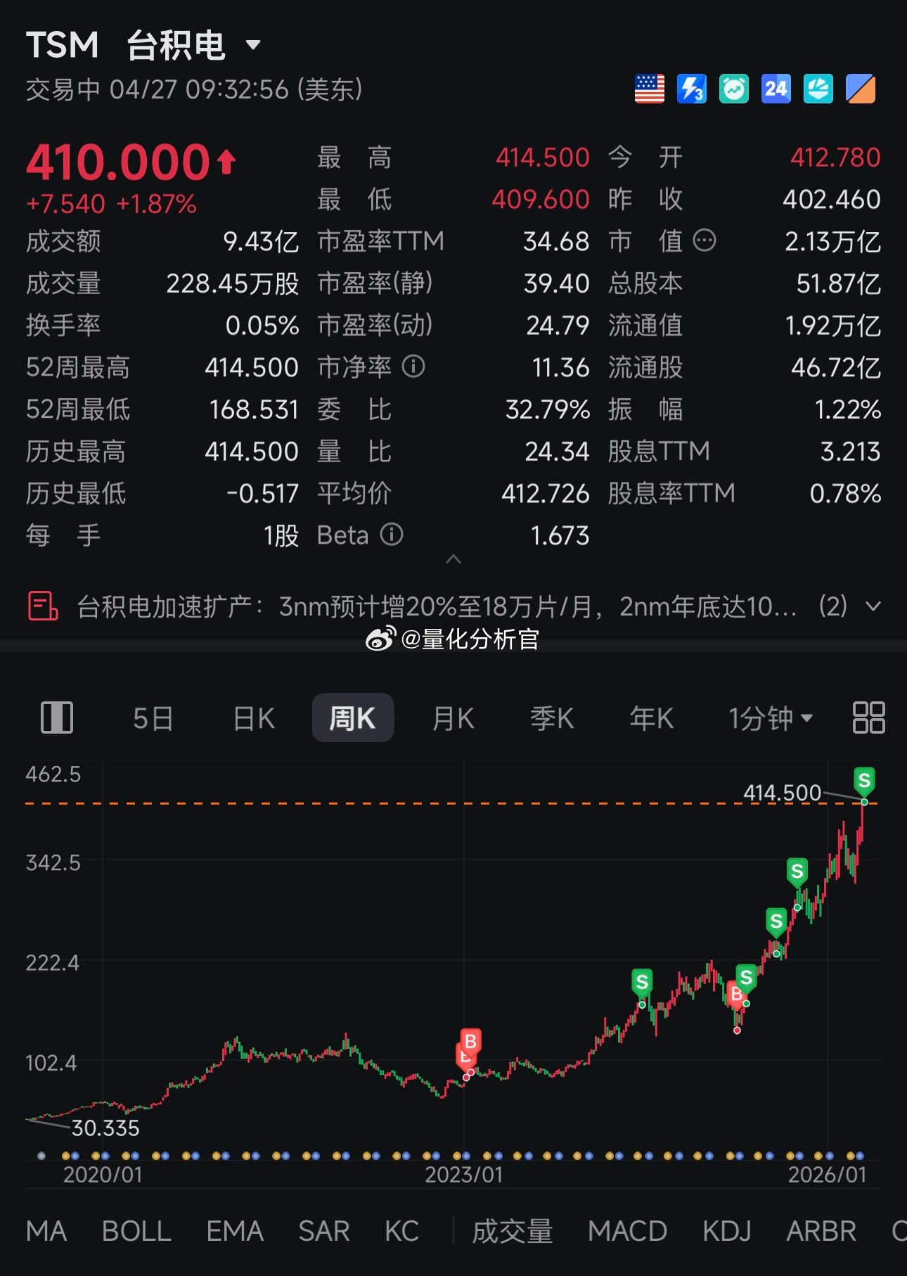 记录下,实在是觉得美股的估值过于夸张了,大家应该都知道我台积电持有3年多了,今天彻底清仓,承认自己的愚蠢,认知有限,机会留给其他人吧美股