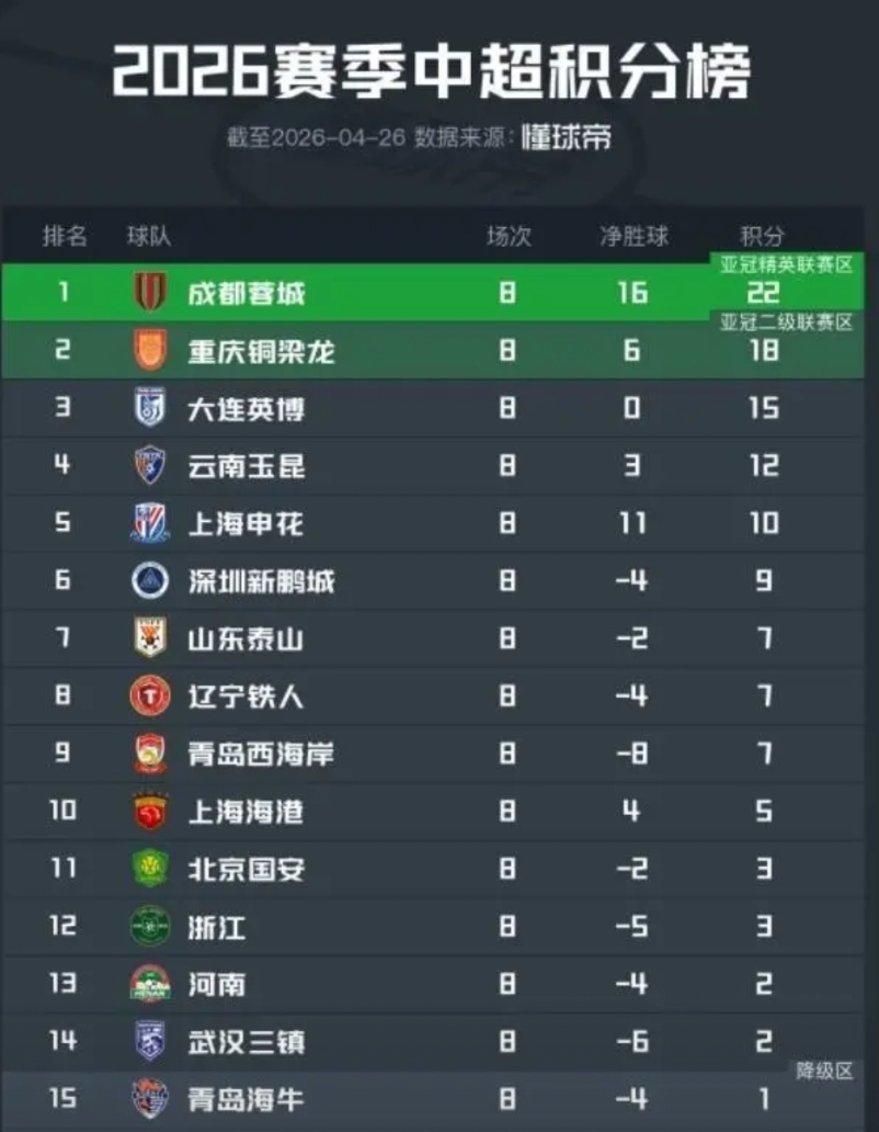 中超联赛第8轮结束,成都蓉城已经势不可挡,争冠对手仅有申花具备一战之力,虽然他们扣了十分,但是现在已经冲到联赛第五,下轮将正面对决成都蓉城 降级区方面,青岛海牛摆脱了负分,津门虎也找回了状态,三镇则是低迷,急需扭转颓势