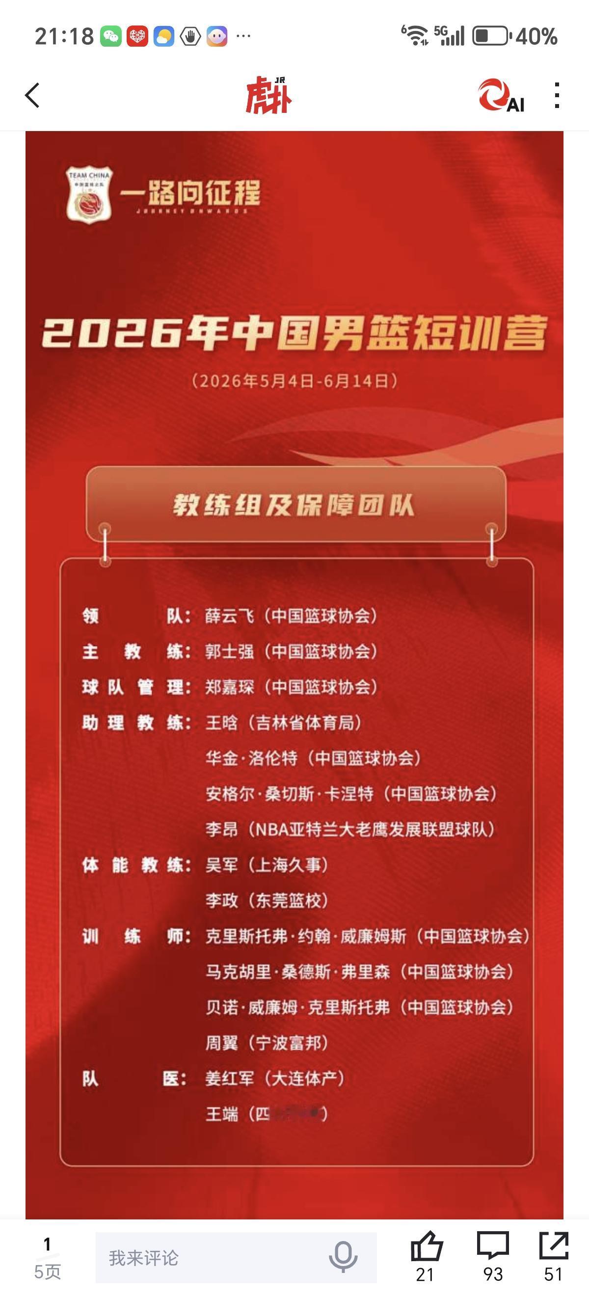 中国篮协在5月3日,到6月14日之间,组织了一个中国男篮的短期训练营。主要参加的球员来自,打完常规赛,没有进入季后赛球队的球员,还有一些大学生球员,海外球员等!其中新疆男篮成为大赢家,有李炎哲,齐麟,冯傲,艾孜买提,伊力福拉提,杨芮共六名球员入选。 至于举办本期短训营的目的,篮协说是:本次男篮短训营的核心目标在于考察年轻运动员,帮助年轻队员熟悉国家队技战术体系,为2027年世界杯和2028年洛杉矶奥运会扩充后备人才储备,希望优秀的年轻运动员能够感受国家队的训练氛围,也期待他们展现实力。 至于选拔的球员来源:中国篮球之队官方发布文章说,此次人选来源为非季后赛行列的CBA俱乐部球员、海外球员和大学生球员。 不管这么说,这也是中国篮协对一些边缘球员,年轻球员的一种,国家队层面的集训福利吧!另外如果伊力福拉提入选,如与篮协勾通过的话,证明伊力福拉提已经脚伤痊愈了!这对新疆男篮倒是个好消息吧!中国男篮 新疆男篮 伊力福拉提