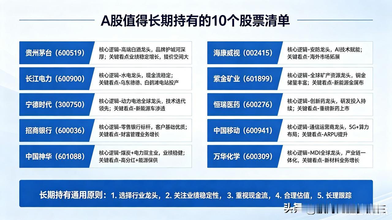 A股值得长期持有的10个股票 中国股市牛短熊长,很多股票周期波动较大,甚至有些股票完全走出来回的“A字杀”走势。 因此,不少投资者认为A股不适合做长线价值投资。但在我看来,持有这种观点的投资者一定是没有选择好合适的长线标的。 尽管A股的优质资产确实占比不多,但在5000多只上市公司中,大概至少有10%的标的适合做长线持有。 下面股海整理出一份A股长期持有(3–10年)的10只龙头清单,覆盖消费、科技、能源、金融、高端制造,每只都附核心逻辑+关键看点,偏价值与成长兼具,适合做底仓长期拿。 ⚠️ 不构成投资建议;长期持有也需要分批买入、控制仓位、跟踪基本面。 1)贵州茅台(600519)— 消费龙头/品牌壁垒 - 逻辑:高端白酒绝对龙头,品牌+工艺+地理稀缺,强定价权,毛利率长期90%+。 - 看点:现金流充沛、分红稳定,穿越周期能力最强,机构重仓“压舱石” 。 2)长江电力(600900)— 绿电/现金流之王 - 逻辑:全球最大水电公司,三峡+葛洲坝等核心资产永久运营,发电量稳、现金流近乎永续。 - 看点:股息率常年3%–4.8%,波动极小,养老级底仓,每年稳定高分红。 3)宁德时代(300750)— 新能源/全球电池龙头 - 逻辑:动力电池+储能双龙头,全球市占率领先,技术+产能+成本壁垒强。 - 看点:电动车+储能长坡厚雪,全球化扩张,业绩增长确定性高。 4)招商银行(600036)— 零售银行龙头 - 逻辑:“零售之王”,财富管理、私行业务领先,资产质量优、分红稳。 - 看点:低估值+高股息(4%–5%),经济复苏期业绩弹性好,长期ROE稳定。 5)中国神华(601088)— 能源/高股息龙头 - 逻辑:煤电运一体化,资源垄断+全产业链抗周期,高分红承诺。 - 看点:3年分红率≥65%,股息率约9%,能源保供+新能源转型,防御性强。 6)海康威视(002415)— 科技/安防+AI龙头 - 逻辑:全球安防龙头,视频AI+软硬件一体化,政府+企业+消费多场景渗透。 - 看点:AI赋能打开新空间,海外扩张加速,现金流稳,估值合理。 7)紫金矿业(601899)— 资源/金铜双龙头 - 逻辑:黄金+铜双轮驱动,全球矿企前列,资源储量+低成本+扩张能力强 。 - 看点:降息周期利好黄金,AI/新能源拉动铜需求,锂矿新增长曲线 。 8)恒瑞医药(600276)— 医药/创新药龙头 - 逻辑:A股创新药龙头,研发管线丰富+国际化推进,肿瘤、麻醉等领域优势明显。 - 看点:医保谈判后企稳,出海授权增多,长期受益老龄化与创新升级。 9)中国移动(600941)— 通信/算力龙头 - 逻辑:5G+数据中心+政企算力,用户基数+网络壁垒+现金流稳。 - 看点:高股息(3%–4%),AI算力基建核心受益,成长+防御兼具。 10)万华化学(600309)— 化工/全球MDI龙头 - 逻辑:全球MDI产能第一,技术壁垒+规模成本+下游拓展(新能源、可降解材料)。 - 看点:周期底部估值低,新产能落地+新材料转型,长期成长可期。 长期持有通用原则(很重要) 1. 分批买入、不追高:大跌时加仓,避免一次性满仓。 2. 行业分散:消费/科技/能源/金融/医药搭配,降低相关性。 3. 定期复盘:每年检查一次护城河、ROE、分红率,基本面恶化及时调整。 价值投资 股市分析