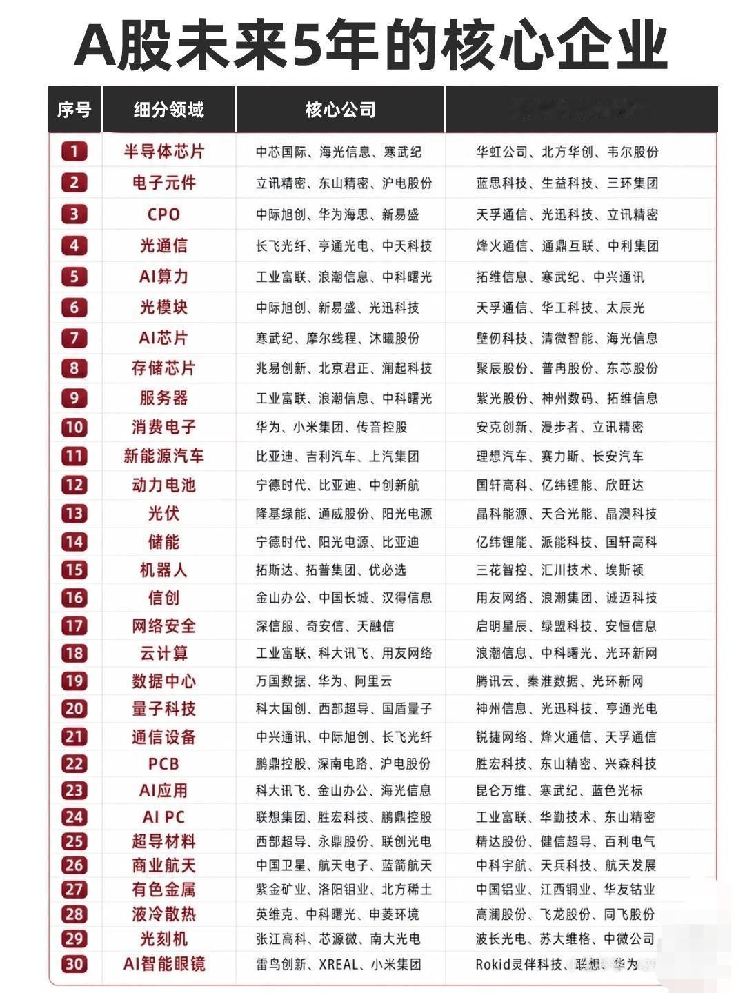 A股未来5年的核心企业梳理 1. 半导体芯片 - 核心公司:中芯国际、海光信息、寒武纪 - 其他值得关注公司:华虹公司、北方华创、韦尔股份 2. 电子元件 - 核心公司:立讯精密、东山精密、沪电股份 - 其他值得关注公司:蓝思科技、生益科技、三环集团 3. CPO - 核心公司:中际旭创、华为海思、新易盛 - 其他值得关注公司:天孚通信、光迅科技、立讯精密 4. 光通信 - 核心公司:长飞光纤、亨通光电、中天科技 - 其他值得关注公司:烽火通信、通鼎互联、中利集团 5. AI算力 - 核心公司:工业富联、浪潮信息、中科曙光 - 其他值得关注公司:拓维信息、寒武纪、中兴通讯 6. 光模块 - 核心公司:中际旭创、新易盛、光迅科技 - 其他值得关注公司:天孚通信、华工科技、太辰光 7. AI芯片 - 核心公司:寒武纪、摩尔线程、沐曦股份 - 其他值得关注公司:壁仞科技、清微智能、海光信息 8. 存储芯片 - 核心公司:兆易创新、北京君正、澜起科技 - 其他值得关注公司:聚辰股份、普冉股份、东芯股份 9. 服务器 - 核心公司:工业富联、浪潮信息、中科曙光 - 其他值得关注公司:紫光股份、神州数码、拓维信息 10. 消费电子 - 核心公司:华为、小米集团、传音控股 - 其他值得关注公司:安克创新、漫步者、立讯精密 11. 新能源汽车 - 核心公司:比亚迪、吉利汽车、上汽集团 - 其他值得关注公司:理想汽车、赛力斯、长安汽车 12. 动力电池 - 核心公司:宁德时代、比亚迪、中创新航 - 其他值得关注公司:国轩高科、亿纬锂能、欣旺达 13. 光伏 - 核心公司:隆基绿能、通威股份、阳光电源 - 其他值得关注公司:晶科能源、天合光能、晶澳科技 14. 储能 - 核心公司:宁德时代、阳光电源、比亚迪 - 其他值得关注公司:亿纬锂能、派能科技、国轩高科 15. 机器人 - 核心公司:拓斯达、拓普集团、优必选 - 其他值得关注公司:三花智控、汇川技术、埃斯顿 16. 信创 - 核心公司:金山办公、中国长城、汉得信息 - 其他值得关注公司:用友网络、浪潮集团、诚迈科技 17. 网络安全 - 核心公司:深信服、奇安信、天融信 - 其他值得关注公司:启明星辰、绿盟科技、安恒信息 18. 云计算 - 核心公司:工业富联、科大讯飞、用友网络 - 其他值得关注公司:浪潮信息、中科曙光、光环新网 19. 数据中心 - 核心公司:万国数据、华为、阿里云 - 其他值得关注公司:腾讯云、秦淮数据、光环新网 20. 量子科技 - 核心公司:科大国创、西部超导、国盾量子 - 其他值得关注公司:神州信息、光迅科技、亨通光电 21. 通信设备 - 核心公司:中兴通讯、中际旭创、长飞光纤 - 其他值得关注公司:锐捷网络、烽火通信、天孚通信 22. PCB - 核心公司:鹏鼎控股、深南电路、沪电股份 - 其他值得关注公司:胜宏科技、东山精密、兴森科技 23. AI应用 - 核心公司:科大讯飞、金山办公、海光信息 - 其他值得关注公司:昆仑万维、寒武纪、蓝色光标 24. AI PC - 核心公司:联想集团、胜宏科技、鹏鼎控股 - 其他值得关注公司:工业富联、华勤技术、东山精密 25. 超导材料 - 核心公司:西部超导、永鼎股份、联创光电 - 其他值得关注公司:精达股份、健信超导、百利电气 26. 商业航天 - 核心公司:中国卫星、航天电子、蓝箭航天 - 其他值得关注公司:中科宇航、天兵科技、航天发展 27. 有色金属 - 核心公司:紫金矿业、洛阳钼业、北方稀土 - 其他值得关注公司:中国铝业、江西铜业、华友钴业 28. 液冷散热 - 核心公司:英维克、中科曙光、申菱环境 - 其他值得关注公司:高澜股份、飞龙股份、同飞股份 29. 光刻机 - 核心公司:张江高科、芯源微、南大光电 - 其他值得关注公司:波长光电、苏大维格、中微公司 30. AI智能眼镜 - 核心公司:雷鸟创新、XREAL、小米集团 - 其他值得关注公司:Rokid灵伴科技、联想、华为 (注:以上梳理基于产业趋势与行业地位,仅供研究参考,不构成投资建议。)
