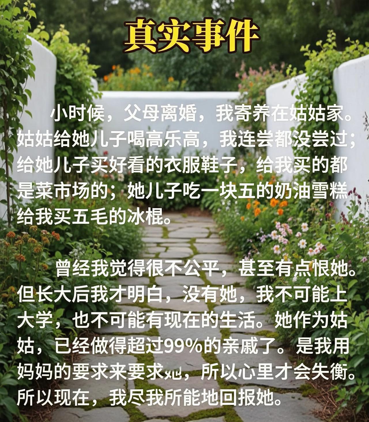 看了这个故事,深深的共情,好多人就是没摆正自己的位置,所以才抱怨这抱怨那的!没有设身处地的为他人着想。 姑姑义无反顾把他带在身边养大,一边要照顾他的生活,操心他的成长,一边还要平衡自己的小家庭,安抚好丈夫,顾及好亲生子女的感受。本来他们一家三口,日子可以过得轻松自在,不用多一份开销,不用多一份牵挂,不用多操十几年的心。 就因为多了一个他,家里的一切都要无条件分出来一大半。姑父和她的孩子,都在默默迁就和包容,放弃了很多本该属于他们的舒服生活。 没有血缘的偏爱,更是难得的恩情,所以更要懂得知足和感恩,往后余生,好好孝顺姑姑,用真心和行动去报答这份天大的养育之恩,不辜负她的委屈,也不辜负她一家人的善良与包容。