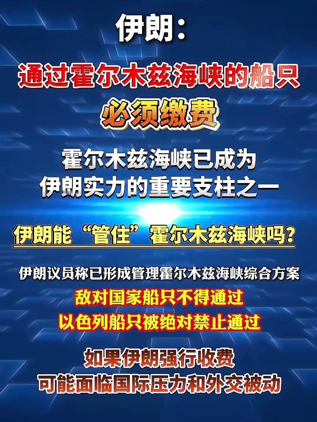 伊朗收过路费,美国装看不见,这场博弈早有答案 当地时间4月26日,伊朗伊斯兰议会国安委主席阿齐兹明确表态,所有通过霍尔木兹海峡的船只必须缴费,没有例外 。这不是一时冲动,是伊朗算清楚账后的必然选择。 很多人觉得伊朗是在针对美国和以色列,其实没那么简单。先看事实:霍尔木兹海峡是全球能源命脉,平时日均通行超百艘船,冲突后断崖式下跌,4月中旬单日甚至只剩3艘 。伊朗要战争消耗,要财政周转,除了收过路费,没有更稳的回本渠道。 再看美国的态度。联合国投票时,不少国家默许伊朗封锁海峡,赌的是“搬起石头砸美国脚”。现在美国真管了吗?没有。它只在阿曼湾盯着伊朗油轮,拦截试图突破封锁的伊朗货船 ,但伊朗堵其他船、收过路费,美国一概不理。不是管不了,是不想管——解封要花大力气,还未必有国家支持,吃力不讨好的事,美国没必要做。 以色列的态度更有意思。以色列压根不把伊朗的威胁当回事,因为它不依赖波斯湾能源。伊朗拿以色列当借口,本质是想拿捏其他国家,让大家为它的战争损失买单。 伊朗说不让美以商船过,更像幌子。查国际船舶通航网络,全年走霍尔木兹海峡的美以商业船舶本就不多。它真正要收的,是那些依赖海峡运输的大户。美以再强,也不会为这点利益硬闯,伊朗想为难也讨不到便宜。 现在的局面很清楚:伊朗把国际水道当成自家内海,阿曼那一半也不管了,逼着全球为它的消耗买单。美国只护自己的利益,对其他国家的困境视而不见。平时喊着世界警察、地区队长,真到要付出代价的时候,没人站出来。 这场博弈没有赢家,只有各自的算计。伊朗要钱,美国要省事,其他国家看风向,霍尔木兹海峡的局势,还会跟着各方的算盘继续走。