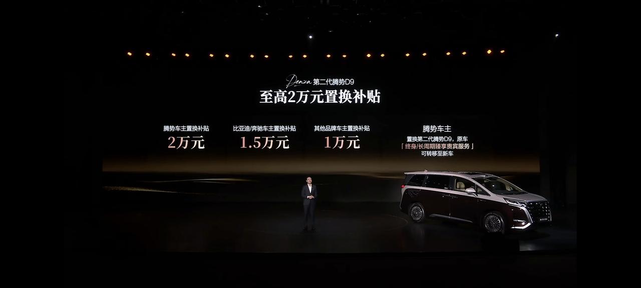 第二代腾势D9上市价出来了:插混版35.98万起,纯电版36.98万起,顶配46.98万。置换补贴最高2万——纯电版40万级就能摸到豪华MPV天花板,插混版35.98万起还带闪充,性价比直接把友商按在地上摩擦! 这次换代重点强化了安全性能,9 个安全气囊、笼式车身 + 五合一健康座舱,140km/h 爆胎稳定控制、130km/h 横风稳定控制稳如老狗,直接刷新了豪华 MPV 的安全上限。连座椅都带五合一健康功能。评论区来个竞猜:有了闪充加持后,你们觉得二代D9,纯电版会卖得好,还是插混版?【来自懂车帝车友圈】