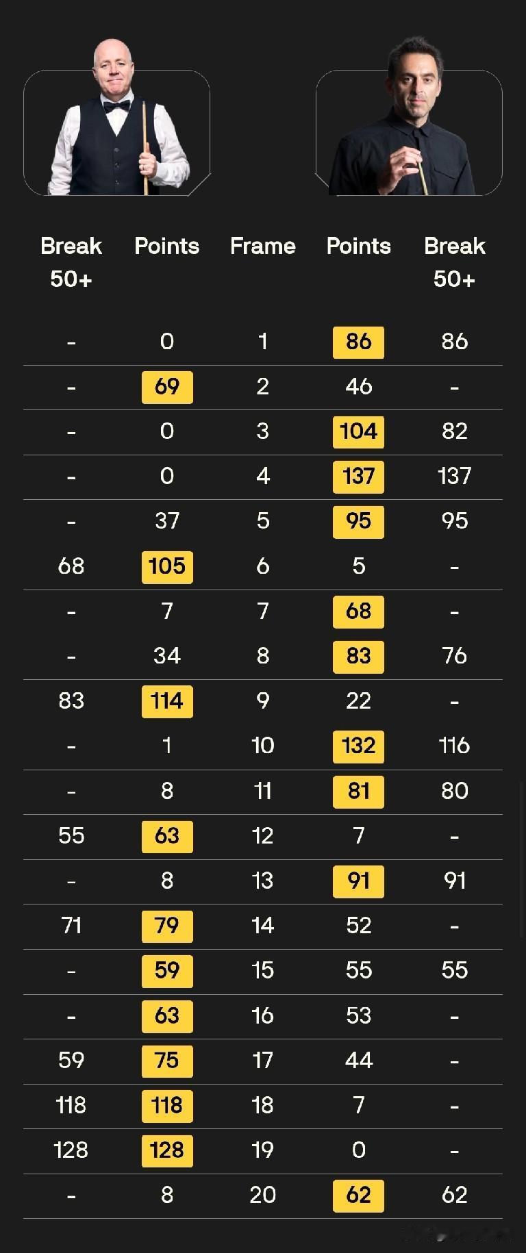 那边吴宜泽和塞尔比的比赛还在胶着之中。同时进行的另外一张桌上,奥沙利文与希金斯第三阶段的上半场比赛已经结束,双方现在战成了10:10平。 第二阶段结束后奥沙利文9:7领先,但第三阶段一上来希金斯状态火爆,单杆分别打出59分、118分和128分。连赢三局后,加上第二阶段的末端,希金斯已经完成了六连鞭,一度10:9反超。关键的第20局,奥沙利文单杆打出62分,强行将比分扳平,双方战成10:10。 另外一边同样9:7领先的吴宜泽,在第三阶段上半场比赛中,虽然率先拿下了一局,但此后塞尔比接连两杆,单杆打出89分、56分,将比分追到9:10。目前双方上半场的比赛第20局正在进行之中。