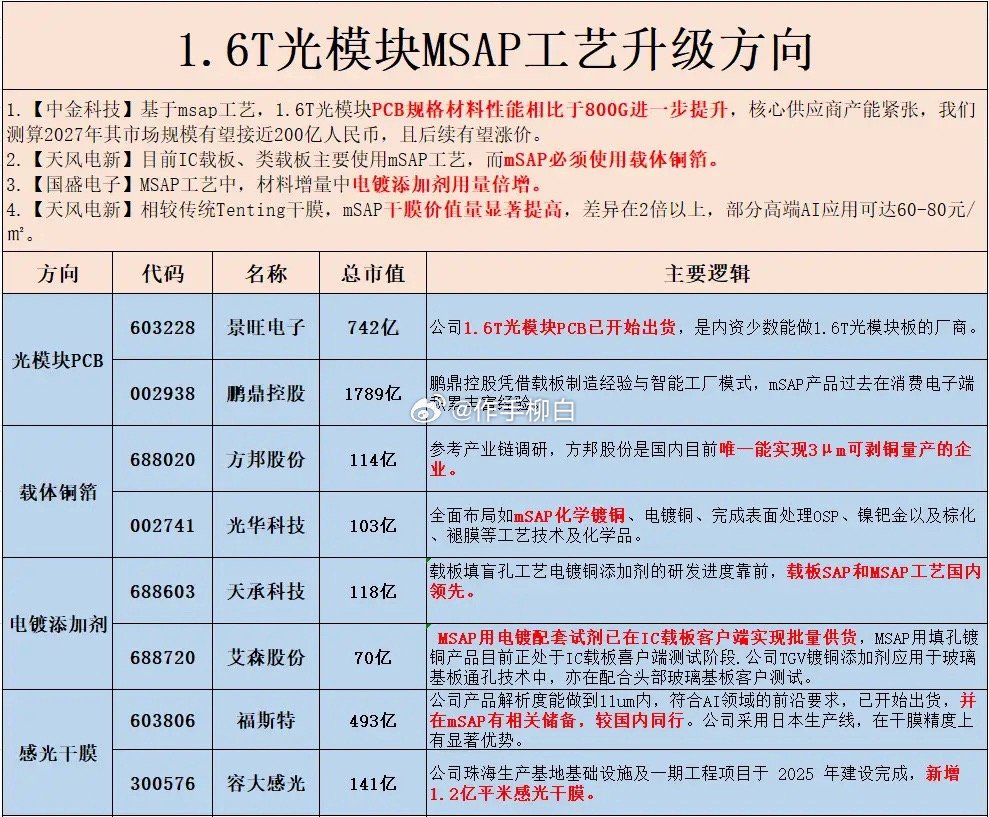 光模块PCB深南电路鹏鼎控股景旺电子弹性比较大的1.6T光模块必须用MSAP工艺需要用到载体铜箔方邦股份