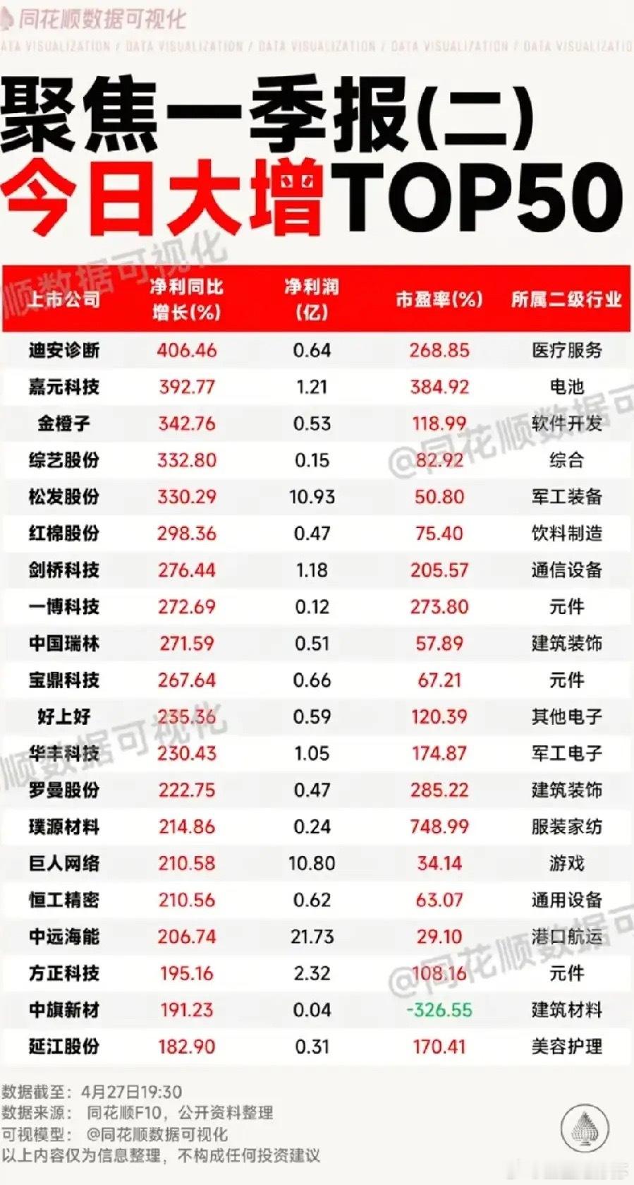 个股梳理分析1. 迪安诊断,医疗服务行业,一季报净利0.64亿元,同比增406.46%,市盈率268.85倍。受益于IVD诊断业务回暖,下游医院检测需求恢复,盈利大幅提升。2. 嘉元科技,电池行业,一季报净利1.21亿元,同比增392.77%,市盈率384.92倍。锂电铜箔需求随新能源扩产复苏,订单提升带动产能利用率与盈利同步增长。3. 金橙子,软件开发行业,一季报净利0.53亿元,同比增342.76%,市盈率118.99倍。工业控制软件及激光设备配套订单放量,制造业自动化升级带动业务增长。4. 综艺股份,综合行业,一季报净利0.15亿元,同比增332.80%,市盈率82.92倍。业务结构优化叠加低基数,项目收益与主业改善共同推高增幅。5. 松发股份,军工装备行业,一季报净利10.93亿元,同比增330.29%,市盈率50.80倍。军工陶瓷配套订单爆发,盈利规模大幅提升,估值处于行业合理区间。6. 红棉股份,饮料制造行业,一季报净利0.47亿元,同比增298.36%,市盈率75.40倍。饮料消费市场回暖,产品结构升级带动毛利率提升,盈利快速修复。7. 剑桥科技,通信设备行业,一季报净利1.18亿元,同比增276.44%,市盈率205.57倍。AI算力需求带动光模块海外订单增长,通信设备业务盈利大幅改善。8. 一博科技,元件行业,一季报净利0.12亿元,同比增272.69%,市盈率273.80倍。PCB配套设计服务需求回升,低基数放大业绩增幅,盈利实现边际改善。9. 中国瑞林,建筑装饰行业,一季报净利0.51亿元,同比增271.59%,市盈率57.89倍。金属矿山工程订单释放,矿业技术服务业务盈利改善,带动业绩增长。10. 宝鼎科技,元件行业,一季报净利0.66亿元,同比增267.64%,市盈率67.21倍。精密铸件业务需求回暖,工业及军工配套订单提升,带动盈利规模增长。11. 好上好,其他电子行业,一季报净利0.59亿元,同比增235.36%,市盈率120.39倍。电子元器件分销业务随消费电子复苏回暖,下游订单增长带动盈利提升。12. 华丰科技,军工电子行业,一季报净利1.05亿元,同比增230.43%,市盈率174.87倍。军工连接器订单随国防信息化建设增长,配套业务盈利大幅改善。13. 罗曼股份,建筑装饰行业,一季报净利0.47亿元,同比增222.75%,市盈率285.22倍。文旅照明项目集中落地,叠加低基数影响,带动业绩大幅增长。14. 璞源材料,服装家纺行业,一季报净利0.24亿元,同比增214.86%,市盈率748.99倍。家纺面料海外出口需求改善,订单回暖带动盈利修复,估值处于高位。15. 巨人网络,游戏行业,一季报净利10.80亿元,同比增210.58%,市盈率34.14倍。游戏产品流水回升,新老项目共同贡献收入,盈利规模稳定,估值偏低。16. 恒工精密,通用设备行业,一季报净利0.62亿元,同比增210.56%,市盈率63.07倍。精密铸件需求随新能源及工业客户复苏增长,订单放量带动盈利提升。17. 中远海能,港口航运行业,一季报净利21.73亿元,同比增206.74%,市盈率29.10倍。油运行业景气度上行,运价维持高位,带动盈利大幅增长,估值合理。18. 方正科技,元件行业,一季报净利2.32亿元,同比增195.16%,市盈率108.16倍。PCB业务盈利修复,下游通信及消费电子需求回暖,带动产能利用率提升。19. 中旗新材,建筑材料行业,一季报净利0.04亿元,同比增191.23%,市盈率-326.55倍。有机硅材料业务边际改善,此前亏损致市盈率为负,盈利小幅修复。20. 延江股份,美容护理行业,一季报净利0.31亿元,同比增182.90%,市盈率170.41倍。无纺布及卫生材料订单回暖,低基数带动业绩实现大幅增长。总结本次上榜个股增长驱动多元:油运、军工、AI通信等赛道标的依托行业红利稳定盈利;消费相关标的受益复苏实现修复;部分标的靠低基数扭亏达成高增幅。龙头标的盈利确定性更强,中小市值标的持续性有待验证,整体反映A股多赛道复苏格局。