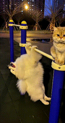 家人们快看啊!恁见过带猫带狗晚上出来健身的没? 这美女可真中,带着金渐层猫咪和博美小狗儿就上小区健身器材了! 你看那猫咪,稳稳当当蹲在单杠杆上,跟个老干部视察似的,一脸淡定。 再看这博美小狗儿,“噌”一下跳上去,爪子扒着杆儿就不撒手了,跟被焊住了一样,张着大嘴跟喊救命似的。 主人在旁边喊:“别动!给恁俩拍个照!” 这画面,猫咪淡定如大佬,狗子慌得一批,反差萌直接拉满!猫咪 狗狗 搞笑 带小狗健身 带猫玩耍 带宠物遛狗