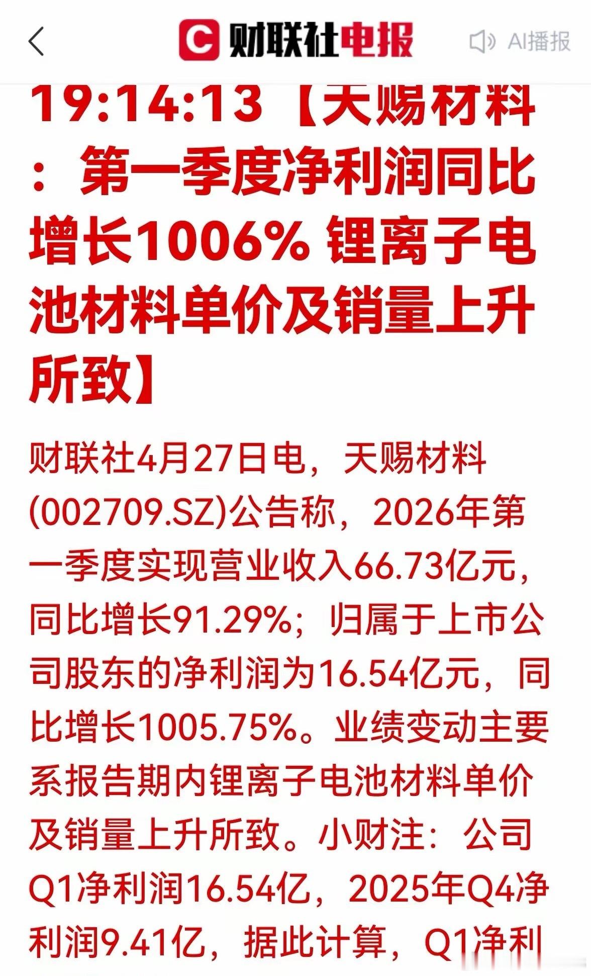 电池小龙迎来业绩超级利好!暴涨1006%!天赐材料一季报炸裂,锂电材料彻底反转🔥4月27日晚间,天赐材料披露2026年一季报,业绩直接引爆市场!报告期内,公司营收66.73亿元,同比大增91.29%;归母净利润狂揽16.54亿元,同比暴涨1005.75%,超10倍增长!不仅同比史诗级暴涨,环比同样爆发力拉满。对比2025年Q4的9.41亿净利润,本季度环比涨幅高达75%,季度盈利持续加速走高,景气度持续上行。公司直言,业绩大增核心原因,就是锂离子电池材料单价+销量双重上涨。经历漫长价格下行周期后,锂电电解液产业链迎来强势复苏,量价齐升逻辑全面兑现,龙头企业盈利弹性彻底释放。曾经被市场持续担忧的锂电中游,正在用超预期业绩,打醒所有悲观资金。电解液龙头业绩翻倍式爆发,也意味着新能源锂电赛道底部反转信号明确,行业供需格局持续改善,上游材料盈利修复正式进入快车道。十倍净利增长,环比持续高增,天赐材料这份答卷,无疑给整个锂电板块注入强心针。接下来新能源产业链景气度能否持续延续,我们持续跟踪。A股 天赐材料 一季报 锂电池 新能源⚠️风险提示:以上内容仅为公开资讯解读,不构成任何投资建议,股市有风险,投资需谨慎。