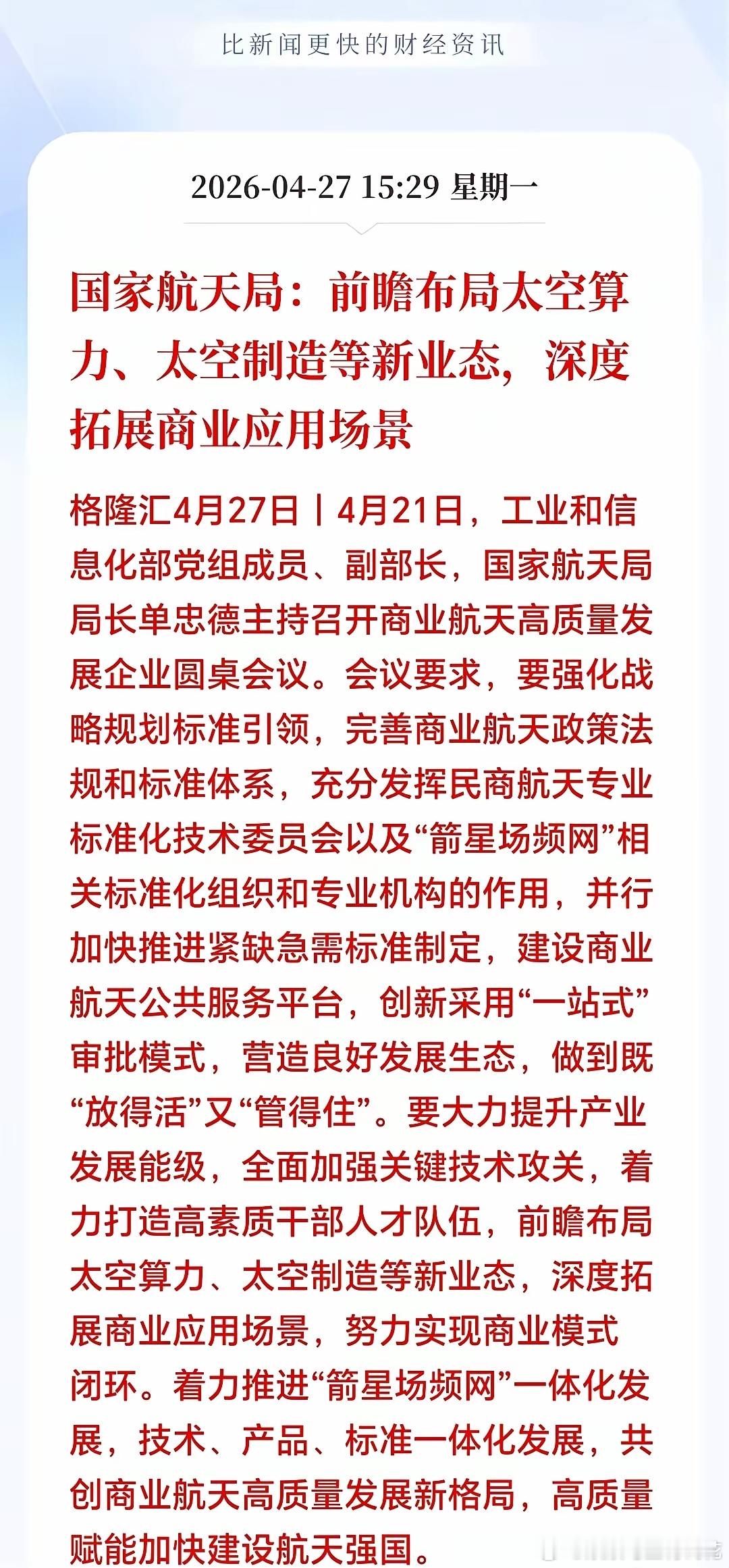 盘后突发大利好!商业航天出大事了,这次真的按不住。先聊聊今天盘面,A股收盘沪指仅涨了0.16%,权重股压制了大盘上涨。创业板虽然绿了,但全市场近3300家上涨,午后黄线明显拉升。这说明大资金在调仓,中小盘题材股开始活跃,对散户来说,题材股回暖,赚钱机会就上来了。盘后突发大利好!政策利好来了:商业航天获“国家级”背书国家航天局开会定调,要搞“一站式”审批,重点点名太空算力、太空制造。这不仅是利好,更是把商业航天从“讲故事”升级为“国家战略新业态”。箭、星、场、频、网一体化,政策壁垒打破,行业将要进入快车道。太空算力不再是科幻了。地面算力受限于能耗和散热,太空有无限太阳能和极低温,是天然的超级机房。政策前瞻布局,意味着卫星互联网、星载计算芯片、太空数据中心这些硬科技标的,有着实实在在的业绩预期。策略应对:盯紧“硬科技+小市值”今天盘面,大金融走弱,资金明显流向科创板和科技题材。操作上别追高权重,重点看卫星导航、航天装备、算力基础设施。政策刚落地,情绪还在发酵,切记别盲目追高,等回踩低吸才是王道。你觉得这波商业航天大利好能让你回血吗?欢迎评论区留言,一起探讨!