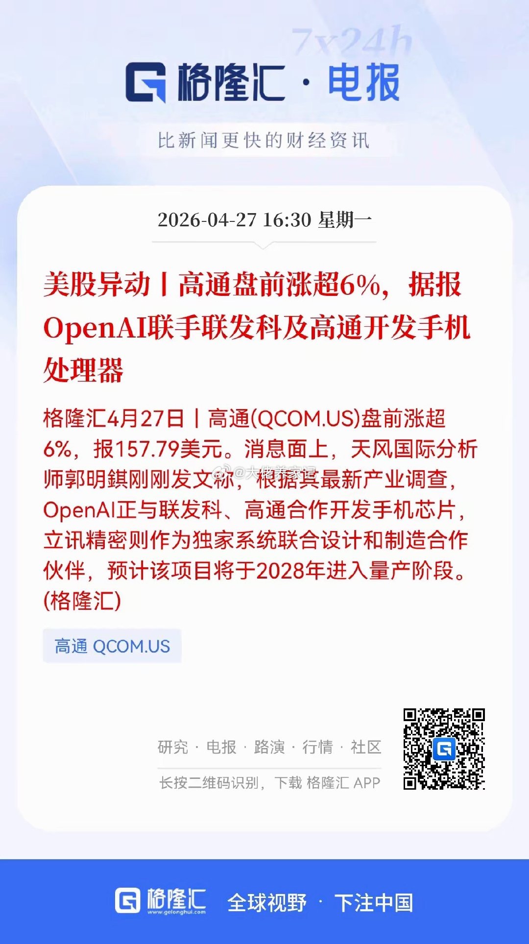 利好!重磅利好消息!OpenAI联手联发科及高通开发手机处理器,消息引爆市场!高通盘前大涨6%,4月27日,市场传出OpenAI将联手高通、联发科开发手机处理器的消息,直接带动高通盘前大涨超6%。立讯精密作为独家系统联合设计与制造伙伴,预计项目2028年量产。这一合作,彻底打破了AI与终端芯片的边界。OpenAI此前一直专注于模型研发,这次下场造芯,目标直指解决大模型在手机端的运行痛点。当前AI手机的核心瓶颈,是端侧算力不足、模型运行功耗过高,而高通、联发科作为手机芯片巨头,在基带、制程、功耗控制上有成熟的技术积累,双方合作能实现模型与硬件的深度适配,真正把AI大模型“塞进”手机里。随着端侧AI成为手机行业新的竞争焦点,与OpenAI的绑定,将让高通在AI算力调度、模型优化上形成独家优势,摆脱单纯比拼制程的同质化竞争。而立讯精密的加入,则为项目落地提供了制造与系统整合的保障。从行业趋势看,AI手机的竞争,正在从“谁能跑模型”转向“谁的模型和芯片适配更好”。OpenAI、高通、联发科的联手,本质上是要打造一套软硬一体的端侧AI解决方案,重新定义下一代手机的算力标准。这也意味着,未来的手机芯片竞争,不再只是硬件性能的比拼,更考验与AI模型的协同能力。整体来看,这一合作不仅将改变高通、联发科的发展路径,也将深刻影响整个消费电子行业的格局。端侧AI的军备竞赛,才刚刚开始。
