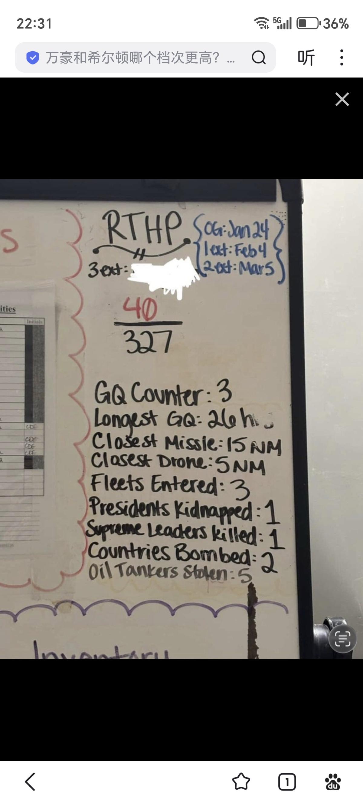 这张据称来自福特号的白板照片正在美国 OSINT 之间广为流传,内容包括: 已部署327天,剩余40天。 全员战备计数器:3 次 最长全员战备值班时长:26 小时 最近导弹距离:15 海里 最近无人机距离:5 海里 已到达舰队数量:3 被绑架总统人数:1 打死最高领袖数量:1 轰炸国家数量:2 劫持油轮数量:5