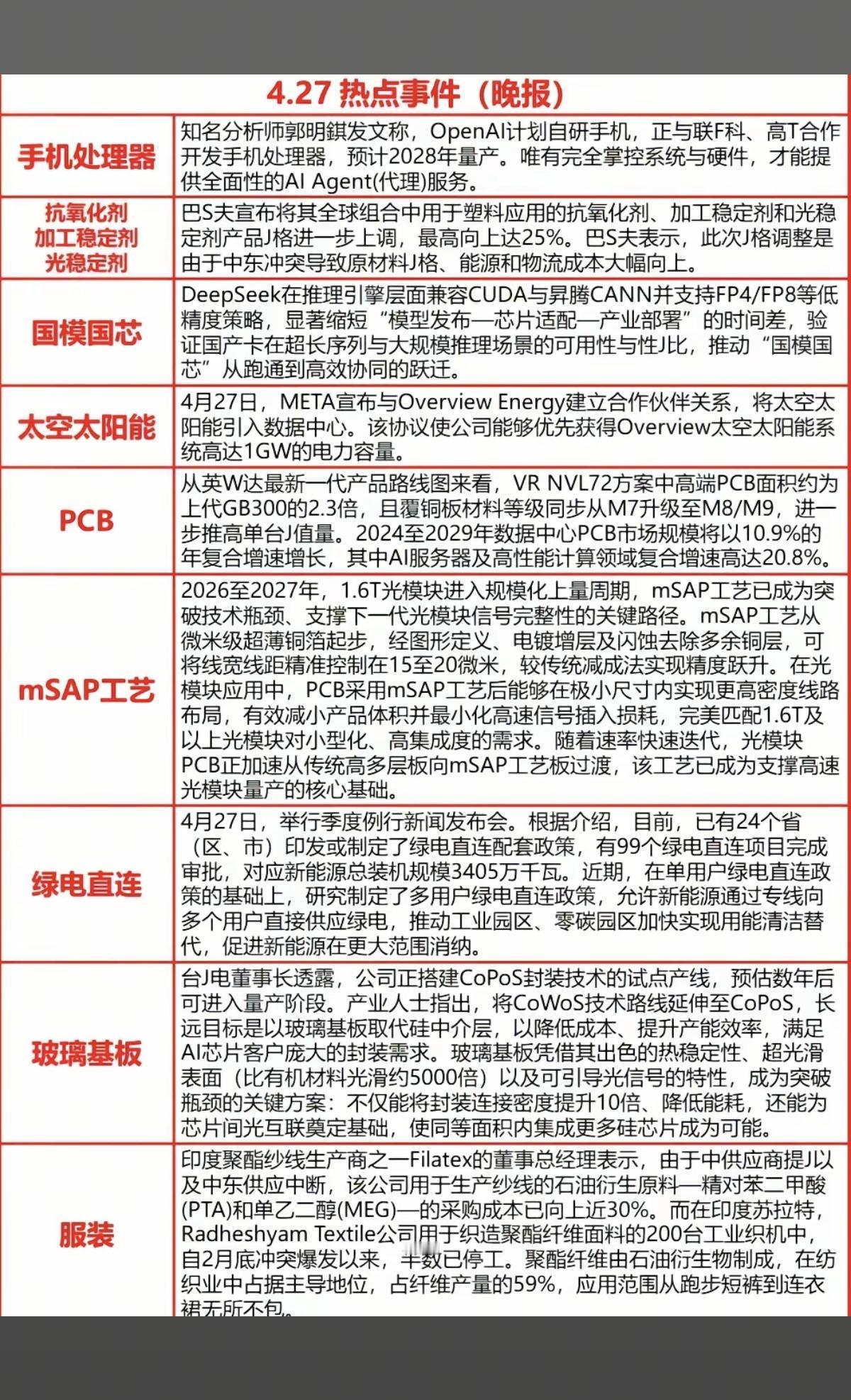 4.27周一晚间 财经热点事件! 1.手机处理器 2.抗氧化剂、光稳定剂涨价 3.太空太阳能 4.绿电直连 5.玻璃基板 6.服装