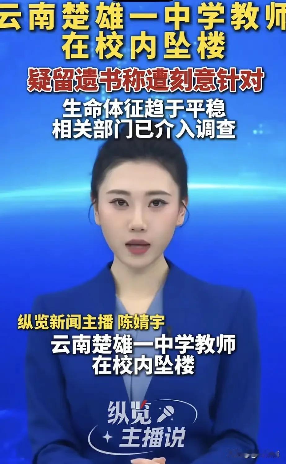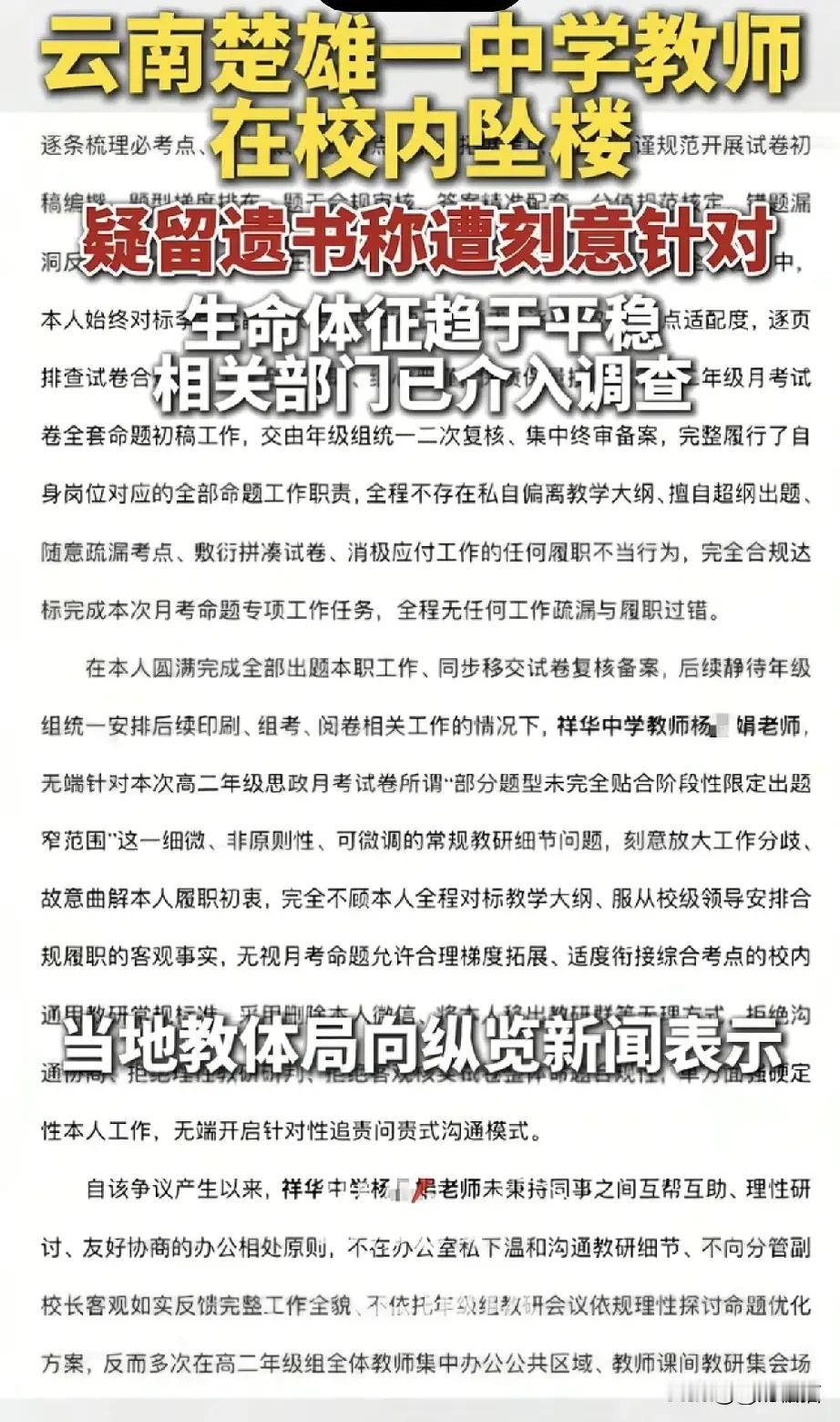 看到云南姚安一中教师坠楼的新闻,心里久久没法平静,只觉得拔凉拔凉的。一个在高三带毕业班的老师,按理说正是给学生打气、冲刺高考的时候,结果自己却差点出了事,真的是让人心里堵得慌。 我们先把整件事的来龙去脉和最新进展,梳理得明明白白。根据多方媒体的实地探访与核实,这起让人揪心的事件,发生在4月24日下午五点半左右,地点就在姚安一中的教学楼内,涉事的张老师从四楼不慎坠落,事发后第一时间被紧急送往医院救治,情况一度十分危急。 好在经过及时抢救,事态总算没有往最坏的方向发展,4月27日,姚安县教体局官方工作人员在回应媒体采访时明确表示,张老师经过全力救治,目前生命体征已经趋于平稳,脱离了生命危险,后续还在医院接受进一步的观察和治疗。 这样的消息,算是这场悲剧里,唯一让人稍感宽慰的地方,也让所有关注此事的人,悬着的心终于放下了一半。 而随着张老师留下的遗书内容逐渐曝光,字里行间的委屈与绝望,字字句句都让人看得心疼不已,也彻底揭开了这场悲剧背后,不为人知的心酸隐情。 整件事的起因,说起来其实并不大,不过是一份看似平常的高二月考试卷。按照张老师遗书中的自述,当时学校安排月考出题任务,他全程尽心尽力,牺牲了自己本就不多的休息时间,严格对照教学大纲的要求,反复斟酌每一道题目、每一个知识点,认认真真、保质保量完成了出题工作,一心只想出一份能真实检测学生学习效果的试卷,尽到自己作为教师的本分。 可这份付出,非但没有得到认可,反而引发了后续一系列的打压。学校一位杨姓老师,以试卷部分题型没有完全贴合阶段性限定的出题范围为由,对张老师的工作全盘否定。这本该是教学上的专业分歧,完全可以坐下来平和沟通、协商调整,可对方的做法,却远超正常的工作争执范畴。 张老师在遗书中写道,自己遭到了这位老师的当众苛责、刻意刁难,随后更是被直接踢出教研群、删除微信联系方式,在同事圈子里被刻意舆论孤立。 试想一下,一个每天扎根在学校,要备课、上课、批改作业、面对高三学生繁重教学任务的老师,本该在同事协作中获得支撑,可当他身处办公室,连周围同事正常的交谈、笑声,都会让他觉得是针对自己的孤立,那种被排挤、被边缘化的窒息感,足以一点点压垮一个人的心理防线。 一边是高三教学的千斤重担,升学率、学生成绩、日常考核、各类会议,每一项都压得人喘不过气;一边是来自同事的无端打压和冷暴力,工作得不到认可,人格得不到尊重,连正常的工作交流都被切断,双重压力层层叠加,长时间处在这样高压、焦虑的情绪里,再坚强的人,也难免会走向崩溃。 目前整件事,姚安县教体局及相关部门还在进一步调查中,最终的事实真相、责任认定,还没有给出官方定论。在这里也必须理性地说一句,即便网络上大家一边倒地同情张老师,我们也不能仅凭一封遗书,就完全定性所有是非。 职场中很多矛盾,往往存在两面性:有时候一方觉得是刻意针对、恶意打压,另一方或许只是性格急躁、说话直白,做事方式过于极端;但也有可能,是长期存在的、让人窒息的职场排挤与刻意打压,这两种情况的性质,有着天壤之别。 我们不偏听偏信,不盲目指责任何一方,静静等待官方的详细调查结果,才是最客观的态度。但抛开事件本身的是非对错,这起事件背后,暴露出来的教师群体精神压力问题,真的再也不能被当成小事忽视了。 很多人觉得,教师工作体面又轻松,有寒暑假、工作稳定,却从不知道这份职业背后,藏着多少不为人知的心酸。老师们要扛着教学成绩的压力,要盯着学生的学习与心理状态,要应付没完没了的会议、考核、检查,要处理繁杂的教学琐事,还要维系职场中的人际关系。 他们是学生的依靠,是家长的寄托,却很少有人关心,他们自己也会疲惫、也会委屈、也会被压力压得喘不过气。整件事里,最让人感慨的一点是,张老师能把遗书写得条理清晰、把自己的痛苦与遭遇描述得具体真切,足以看出他是一个做事认真、心思细腻、凡事较真的人。 这样的人,对待工作兢兢业业,对待他人真诚本分,可也恰恰是这类心思重、在意他人看法、不愿将就妥协的人,在遭遇无端指责、被孤立排挤时,最容易钻牛角尖,最容易陷入自我内耗,最终被负面情绪彻底吞噬。 校园本该是一片纯净的净土,教师职场也本该是充满协作与尊重的地方,不该变成勾心斗角、充满冷暴力的职场江湖。 真心希望当地相关部门,能够尽快彻查此事,落锤定音,还原事件的全部真相,给张老师一个公道,给公众一个明确的交代。 也希望每一位坚守在讲台的老师,都能被温柔以待,他们守护着学生的未来,也该有人守护他们的心理健康,别让职场冷暴力,寒了认真教书之人的心,别让兢兢业业的教育者,在压力与委屈中,失去对生活的希望。消息来源@纵览新闻