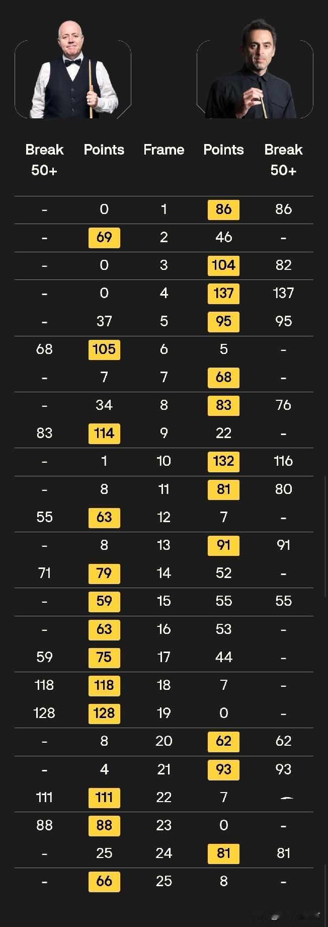 恭喜希金斯,同时也向奥沙利文致敬!在这场斯诺克世锦赛1/8决赛中,75三杰的两位名宿上演了一场精彩的25局大战。 火箭开局一度4:1领先,并且最多时8:3领先过。但顽强的希金斯一点点的将比分追上,并且在决胜局中牢牢把握住场上的局面,艰难的拿下了这场巅峰对决。 从赛后的技术统计来看,希金斯三杆破百,六杆50+,整体发挥平稳。而奥沙利文只有2杆破百,不过他有9杆50+。 总得分奥沙利文1419分要远高于希金斯的1270分,但他却输掉了比赛,或许这也就是斯诺克的魅力所在。