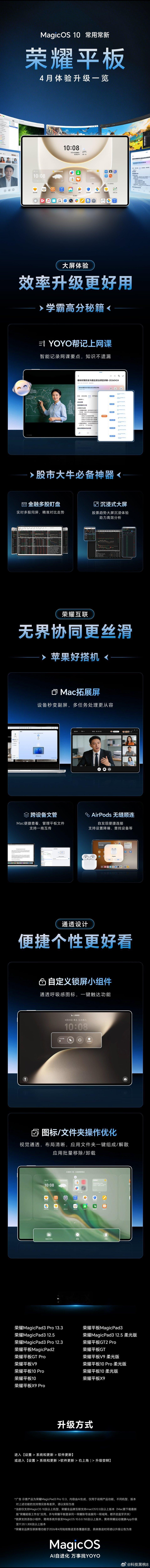 四月全新旗舰平板荣耀MagicPad3Pro正式上线啦。这次跟着新品一起上新的MagicOS超多实用新功能,也陆续适配到平板多款新旧机型。荣耀一直坚持系统长期持续升级优化,不止手机每月都能迎来版本更新,平板、折叠屏等全线产品都能长期保持流畅好用。四月大批平板机型同步系统升级,界面颜值更高、日常操作更顺手,运行体验也更加顺滑。MagicOS月月新、荣耀MagicPad3Pro