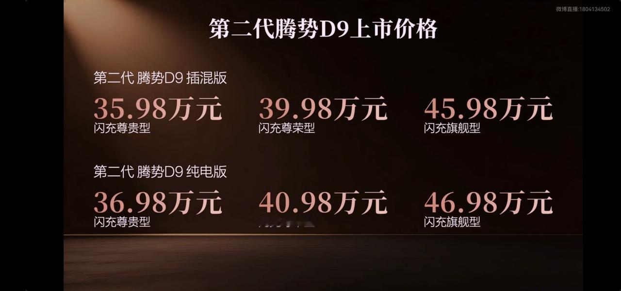 全新腾势D9闪充35.98-46.98万上市了 这价格咋样?中端豪华的价格,还送你12个月的免费闪充。 基础参数来说,其实还是不错的,纯电800公里起步,四驱750,续航非常给力,但纯电比插混还要贵一些。不过如果不跑市外长途,还是纯电香。另外其实插混也不错,纯电都有400km,市内一直用电没啥大问题了。 配置的话,插混推荐从第二个配置开始选起,零重力座椅和Nappa真皮座椅要第二个配置才给。纯电的话,低配就已经不错了,真皮、零重力都安排了,+4万多给的增幅不是那么划算。不缺钱的话,直接顶配就行了。发布会宣传的都给。 闪充纯电版: 36.98万 闪充尊贵型 800km/二代刀片电池/闪充 天神之眼5.0/双阀云辇C/22扬声器 真皮座椅/ai座舱/二排Air SPA零重力座椅/副驾智能屏 40.98万 闪充尊荣型 750km/电四驱/17.3寸二排吸顶屏 可选装真皮云绒座椅 46.98万 闪充旗舰型 双13寸磁吸生态屏/锻造轮毂 30扬声器/麂皮顶棚/澳洲羊毛压脚垫 插混闪充版 35.98万 闪充尊贵型 401km/二代刀片电池/是从充技术 天神之眼5.0/双阀云辇C/电四驱 真皮座椅/ai座舱/副驾智能屏/22扬声器 39.98万 闪充尊荣型 Nappa真皮/二排Air SPA零重力座椅 17.3寸二排吸顶屏 45.98万 闪充旗舰型 双13寸磁吸生态屏/30扬声器 澳洲羊毛压脚垫/麂皮顶棚/锻造轮毂【来自懂车帝车友圈】