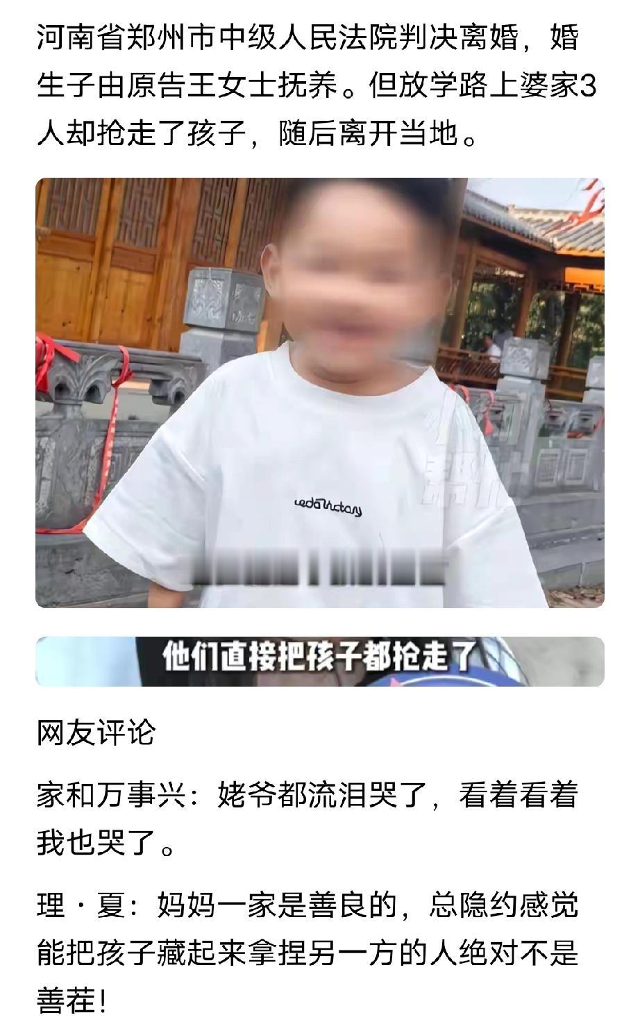 河南洛阳,女子为了有个孩子,花十几万、挨了500多针做试管婴儿,好不容易怀上孩子,却在孕期收到陌生女子发来的丈夫不雅照,得知丈夫出轨20多人,甚至和第三者拍婚纱照、认多个“丈母娘”女心死后她起诉离婚,法院判决离婚、孩子归她抚养,可婆家3人却在放学路上抢走孩子藏匿,让她整整3个多月见不到孩子。 王女士曾经有过一段婚姻,但因为各种原因跟前夫分开了。 2020年,她通过相亲认识了现任丈夫,她想着二婚不易,就想找个安稳人过日子,为了给这段婚姻一个孩子,她咬咬牙花了十几万,做了试管婴儿。 钱花了不少,可最让她遭罪的是身体上的各种操作,她的肚子上挨了500多针激素针,忍受着常人难以想象的生理折磨,所幸的是,终于成功怀上孩子。 王女士以为孩子能成为婚姻的粘合剂,没想到,怀孕没多久,她就收到了陌生女子发来的丈夫不雅照片和亲密视频。 对方还告诉她,她的丈夫出轨了20多人,不仅和多个女子保持不清不楚的关系,甚至还和第三者拍婚纱照,在外认了好几个“丈母娘”。 王女士这才后知后觉发现,结婚一年多,丈夫一直瞒着她,用6个手机号、4个微信号周旋在多个女人之间。 一开始,王女士还抱着一丝希望,觉得丈夫有了孩子会收心,她母亲也劝她忍一忍,毕竟是二婚,孩子也来之不易。 可丈夫毫无收敛,依旧我行我素,甚至变本加厉,彻底打碎了她的幻想。 2025年底,心死的王女士终于向法院提起离婚诉讼,只求能保住孩子的抚养权。2026年1月30日,人民法院作出判决,准予双方离婚,婚生子由王女士抚养,男方每月支付1500元抚养费,直到孩子年满18周岁。 本以为摆脱了噩梦,王女士终于能和孩子过上安稳日子,可让她没想到的是,判决书生效后,在一次孩子放学的路上,婆家3人突然冲出来,强行抢走了孩子,随后就带着孩子离开了当地,躲了起来。 王女士整整3个多月没见到孩子,她哭着说,那段时间每天都在崩溃边缘,不知道孩子在哪、过得好不好。无奈之下,她只能向法院申请强制执行,希望能要回自己的孩子。 4月27日,终于传来了好消息,执行法官通过多方查找,终于找到了被藏匿的孩子,将他交还给了王女士。 抱着失而复得的孩子,王女士脸上满是幸福的笑容,她说自己前一天晚上一夜没睡,就睁着眼睛看着孩子,觉得特别幸福。 孩子的姥爷得知消息后也泪流满面,他说希望孩子的爸爸将来能做个好父亲,过平淡的生活,守国家的法律。 这件事在网上引起了巨大的争议。有人心疼王女士,说她太不容易了,为了孩子付出了这么多,却遭遇丈夫的背叛和婆家的抢夺。 也有人指责婆家的行为,说他们无视法院判决,抢走孩子,是典型的违法行为,根本不是爱孩子,只是把孩子当成拿捏女方的工具;还有人质疑男方的行为,出轨20多人,连基本的底线都没有,这样的人根本不配当丈夫和父亲。 而最让人争议的,是有人觉得法院判决孩子归女方抚养,男方一家却能轻易抢走孩子藏匿三个多月,执行力度还是不够,也有人说,即使孩子回到了妈妈身边,这场闹剧给孩子造成的心理伤害,可能一辈子都难以抚平。 《民法典》第1084条规定,离婚后,不满两周岁的子女,以由母亲直接抚养为原则;已满两周岁的子女,按最有利于未成年子女的原则判决;子女已满八周岁的,应尊重其真实意愿 。 本案中,王女士试管生子、孕期遭丈夫出轨,孩子年幼且母亲付出更多,法院据此将抚养权判给王女士,符合“最有利于子女”原则,男方出轨及婆家后续抢孩子的行为,也印证其不适合抚养孩子 。 《未成年人保护法》第24条规定,未成年人的父母离婚时,不得实施抢夺、藏匿未成年子女等行为。 本案中,法院已判孩子归王女士抚养,婆家3人却在放学路上强行抢走孩子并藏匿3个多月,此行为明显违反该法条,既侵犯王女士的抚养权,也严重伤害孩子身心健康,最终法院强制执行找回孩子,依法维护了王女士和孩子的合法权益 。