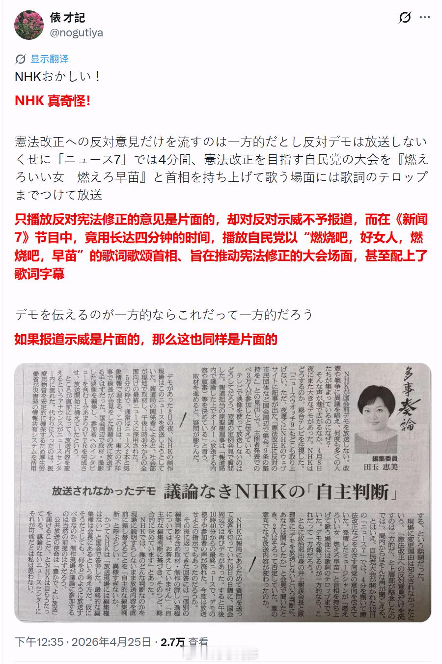 日本网民吐槽NHK。只在报道时说【反对宪法修正是“片面”的】,却对大规模的反对示威不予报道。更搞笑的是,在新闻节目里,耗时四分钟播出以推动宪法修正为目标的自民党大会画面;现场有人高唱《燃烧吧 !好女人!燃烧吧!早苗!》这首歌吹捧高市早苗,节目组还贴心的为这段演唱配了个字幕~(我去找找那首歌给你们听)