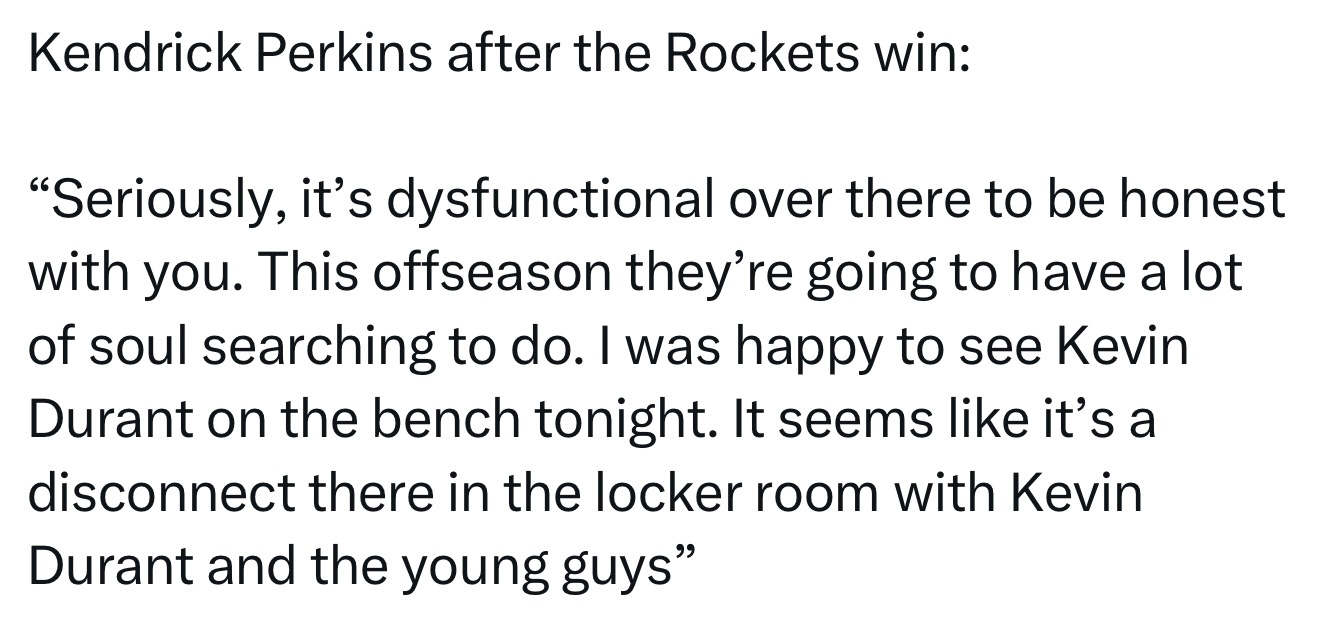 帕金斯表示:“说真的,老实跟你讲,火箭内部已经乱套了。今年休赛期他们得好好自我反省一番。我很高兴今晚看到杜兰特坐在替补席上。看起来,杜兰特和那些年轻球员之间在更衣室里存在着隔阂。”nba季后赛