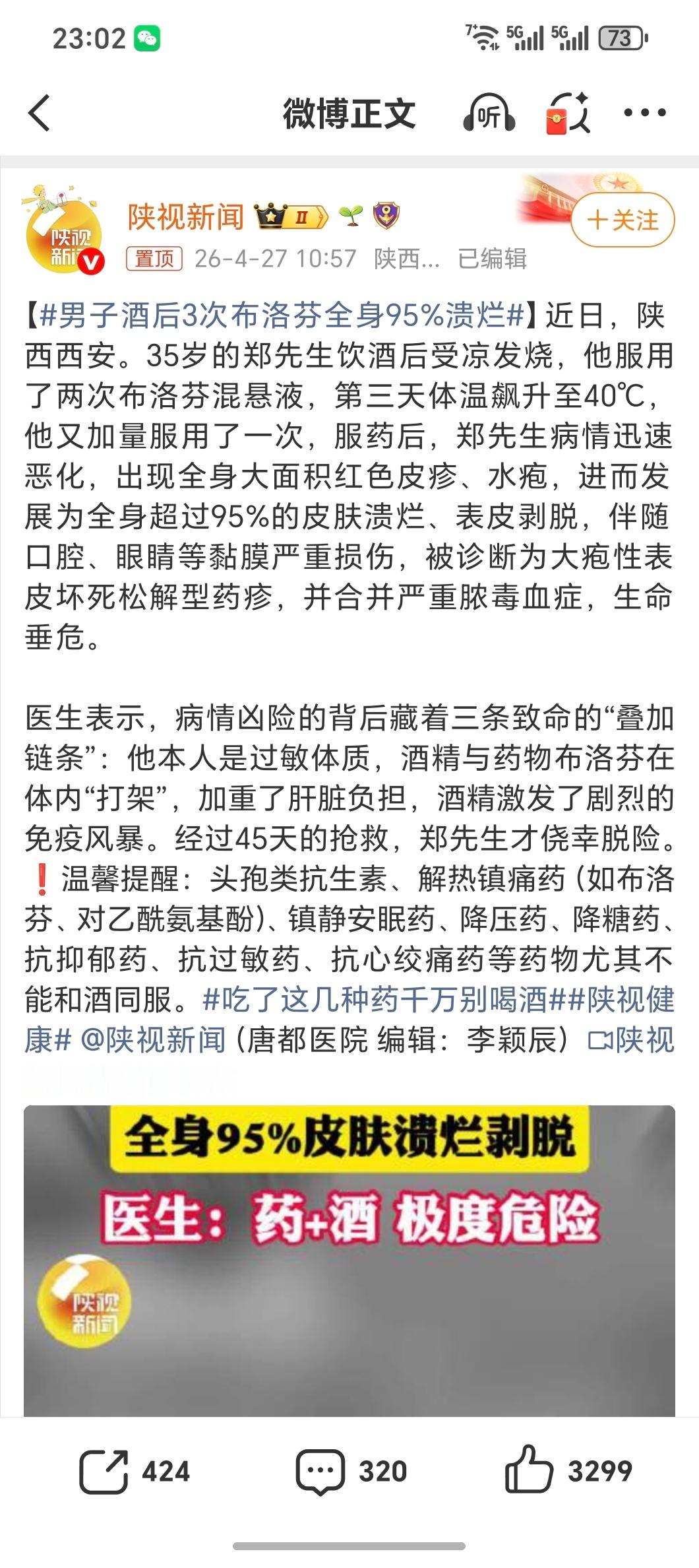 男子酒后3次布洛芬全身95%溃烂太吓人了!喝酒+吃药真的会出大事,布洛芬、头孢、感冒药配酒,轻则伤胃伤肝,重则休克、皮肤溃烂,危及生命,吃药前后7天千万别碰酒!我就是那种一喝酒就上脸、浑身通红的人,以前只是以为自己不耐受,最近连着几次嘴角疱疹,才发现我其实免疫力挺差的,喝完酒免疫力更差,所以朋友们,真的不是不想喝,是真的扛不住,但我可以学倪老师,替大家倒酒服务
