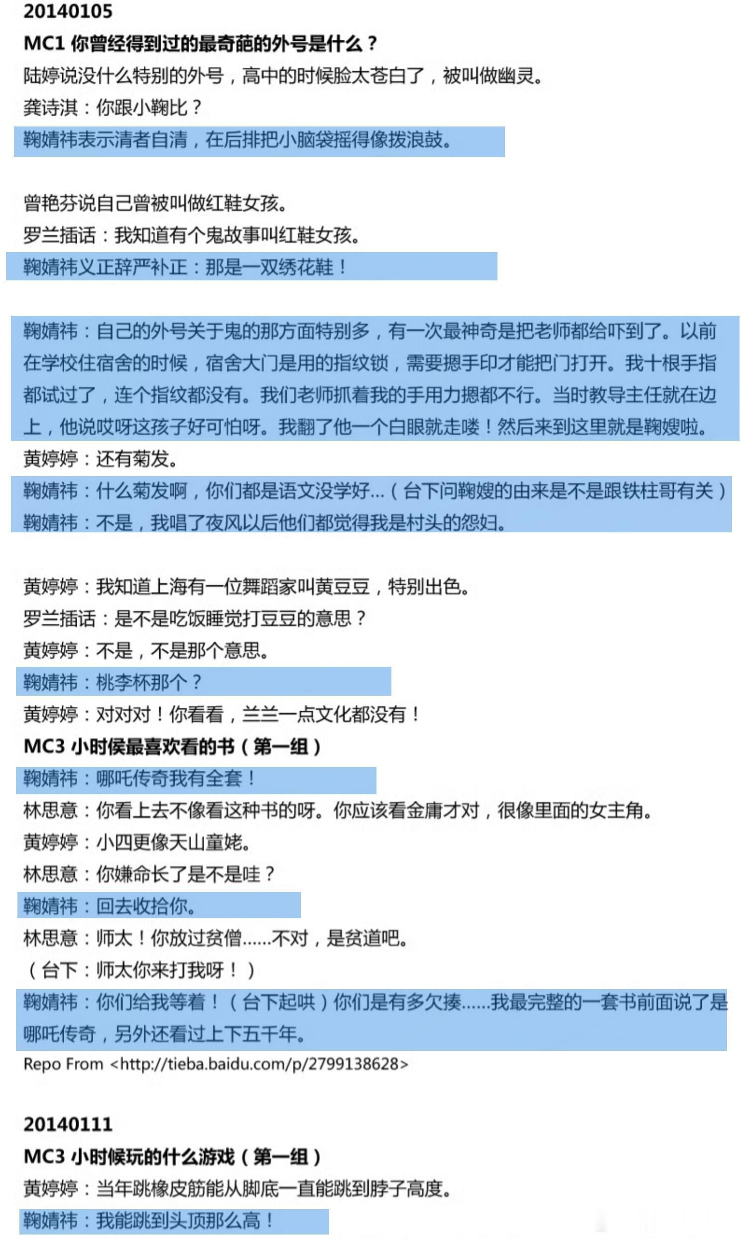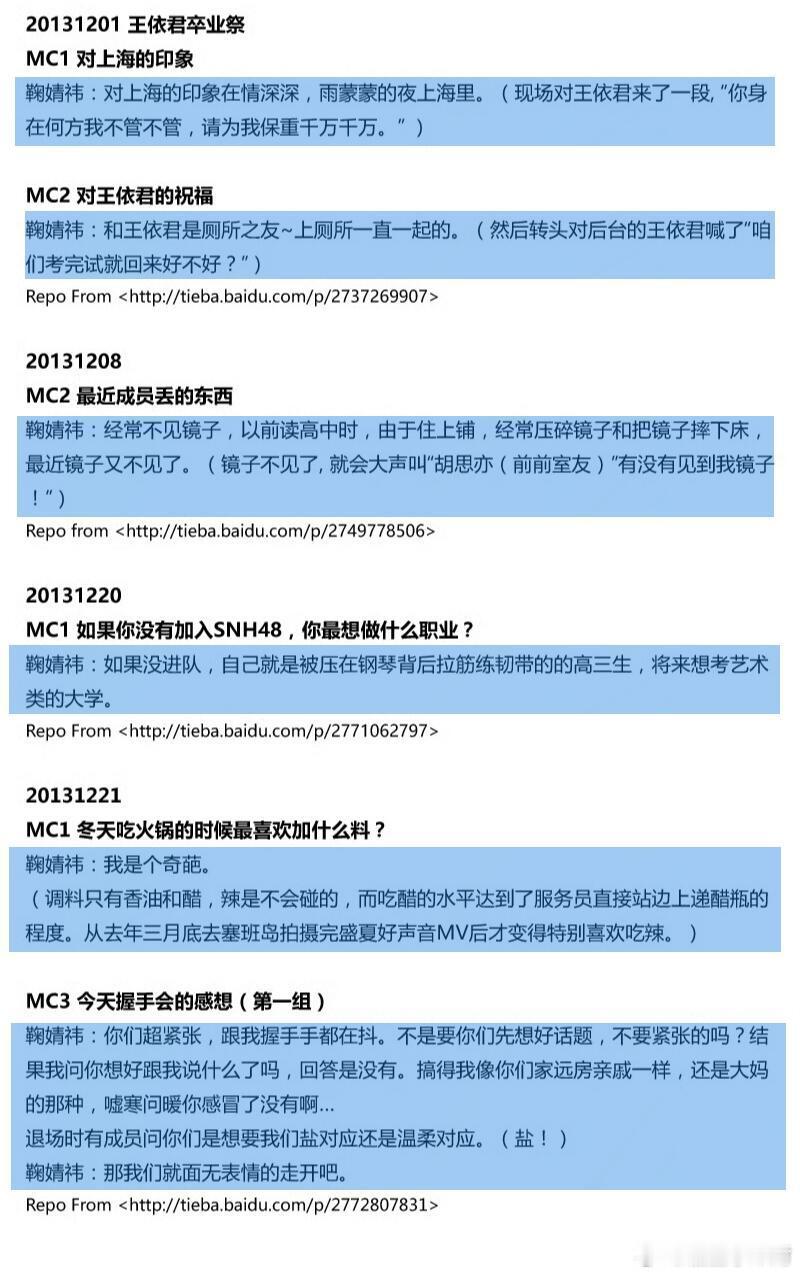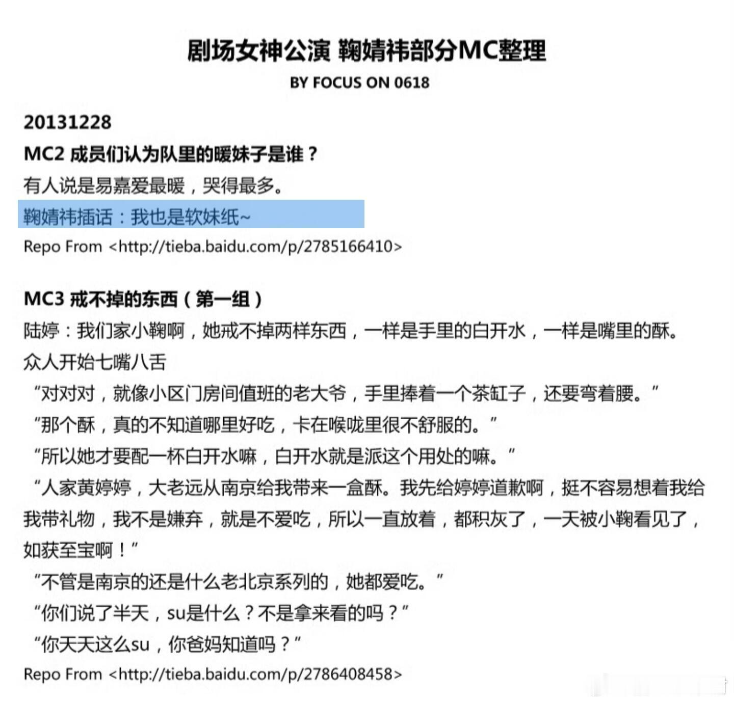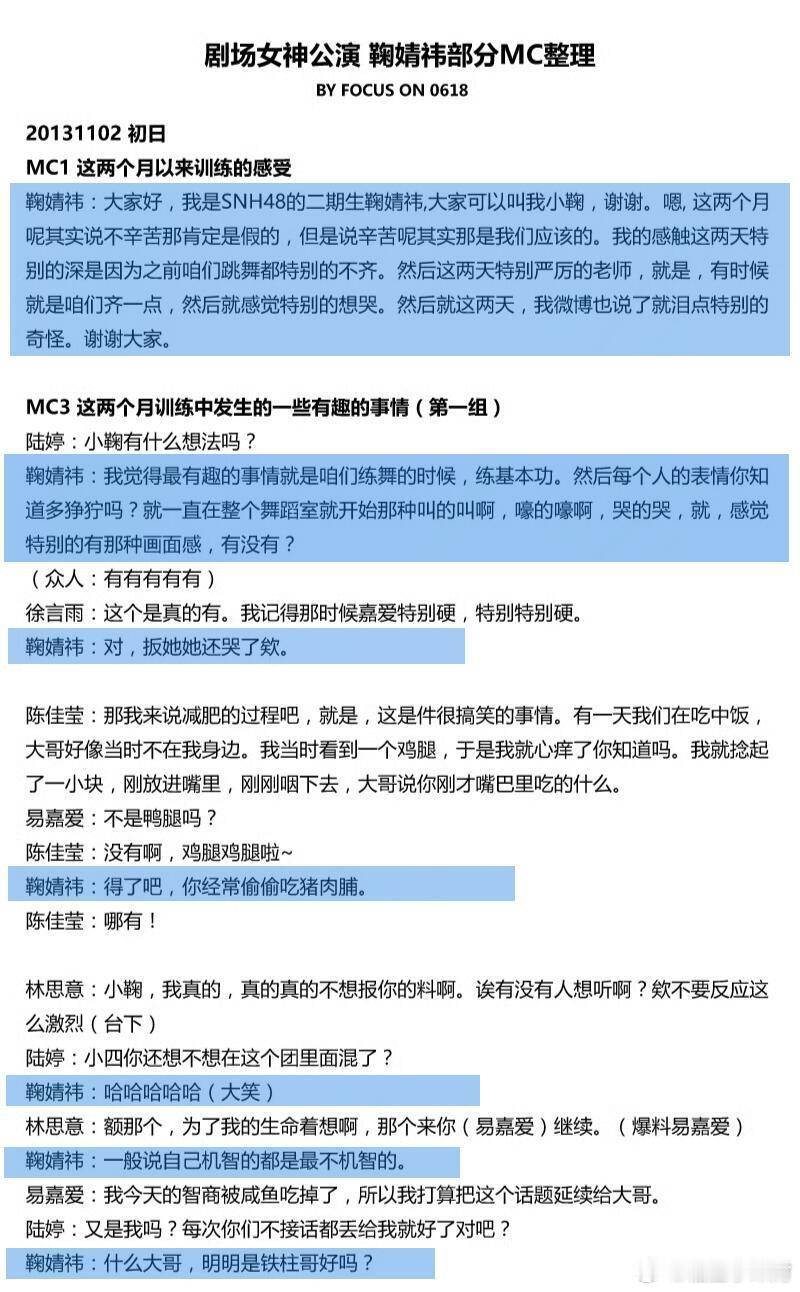 【2013年】其实鞠婧祎是冷幽默😕2013年《剧场女神》公演mc环节,当时官方未开通线上直播,因此许多细节只能靠文字repo记录。鬼系偶像,狂热爱好哪吒传奇,有关于如果没进团对未来的设想等等……她从来不是高冷的女神,而只是一个有些腼腆又冷幽默的小女孩。极致的反差,才最独一无二。