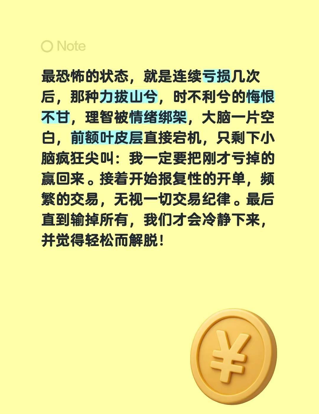 最恐怖的状态,就是连续亏损几次后,那种力拔山兮,时不利兮的悔恨不甘,理智被情绪绑架,大脑一片空白,前额叶皮层直接宕机,只剩下小脑疯狂尖叫:我一定要把刚才亏掉的赢回来。接着开始报复性的开单,频繁的交易,无视一切交易纪律。最后直到输掉所有,我们才会冷静下来,并觉得轻松而解脱!黄金 投资 金融交易