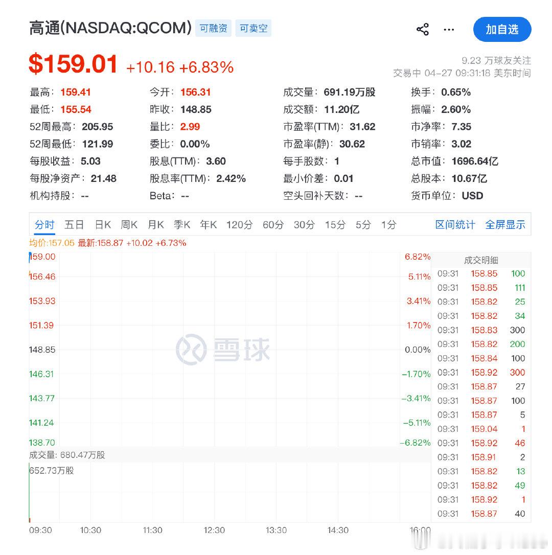 【高通大涨超5%】4月27日,美股三大指数小幅低开,纳指跌0.17%,标普500指数跌0.14%,道指跌0.15%。科技股涨跌互现,高通涨超5%,美光科技涨超3%,Adobe、苹果、特斯拉跌超1%,微软跌0.6%,公司将不再向OpenAI支付收入分成。 (财联社) 高通盘前暴涨超14%曦智科技暗盘暴涨超330%