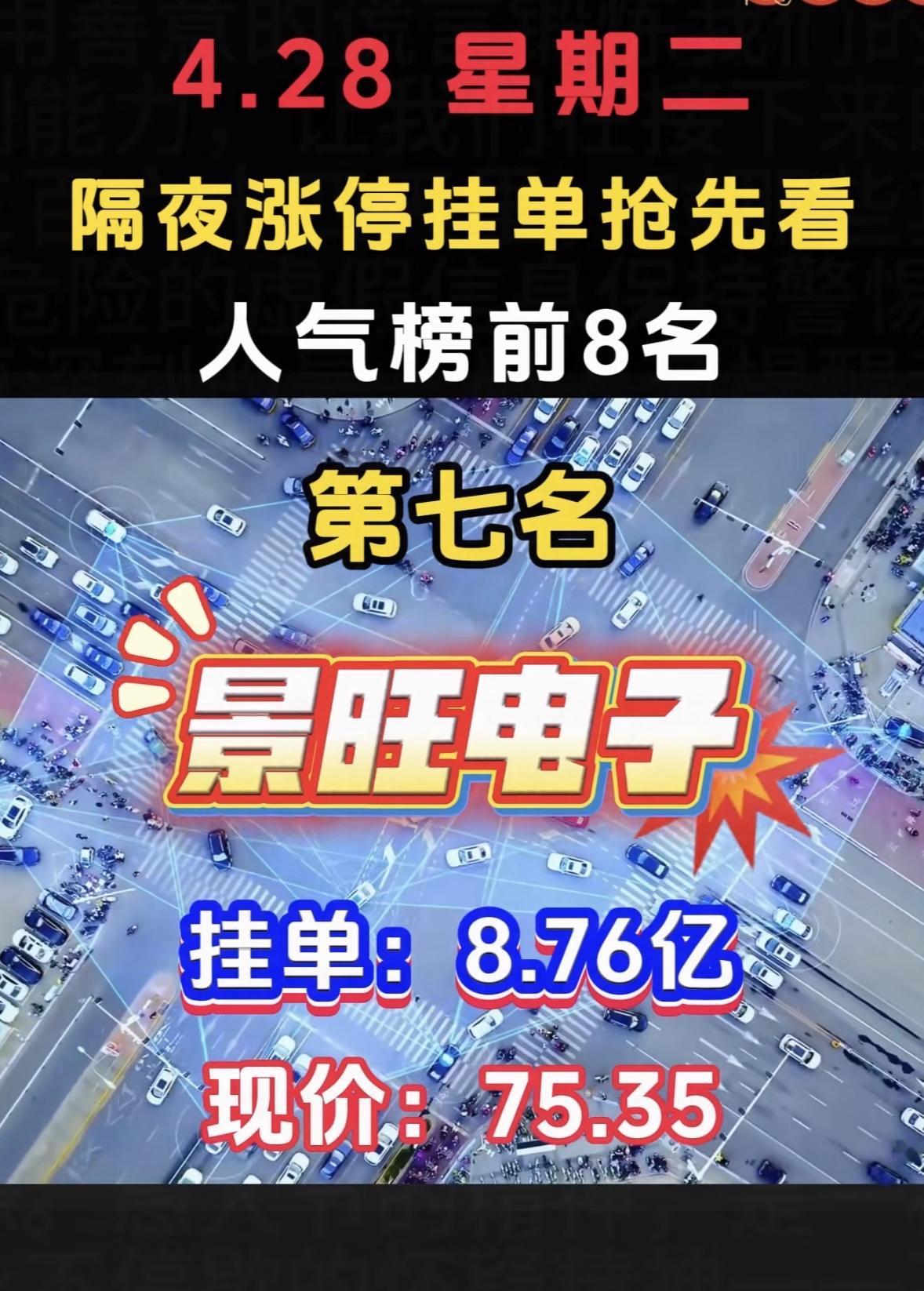 4月28日周二暗盘隔夜挂单排行榜揭晓 4月28日星期二暗盘隔夜挂单排行榜上,景旺电子强势上榜,这可太引人注目了!就拿2026年4月8日暗盘隔夜挂单来说,榜首科瑞技术挂单金额超27亿,前三名挂单总额占TOP 10总挂单量的50%,头部效应明显。榜单覆盖多领域,通信与技术类占前三。高价股如科瑞技术受资金认可,低价股如高乐股份等也因题材或反弹预期上榜。隔夜挂单能反映资金博弈意愿,上榜个股可能交易活跃。景旺电子此次上榜,说不定后续也会有不错表现,但投资有风险,还得谨慎决策。