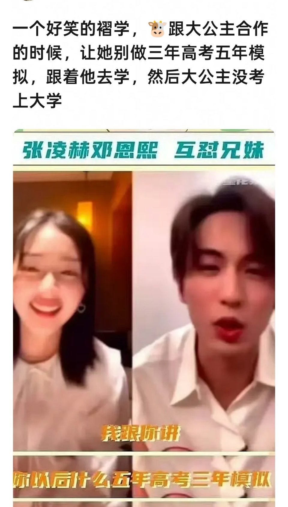 张凌赫跟邓恩熙合作的时候,让她别做三年高考五年模拟,跟着他去学,然后邓恩熙没考上