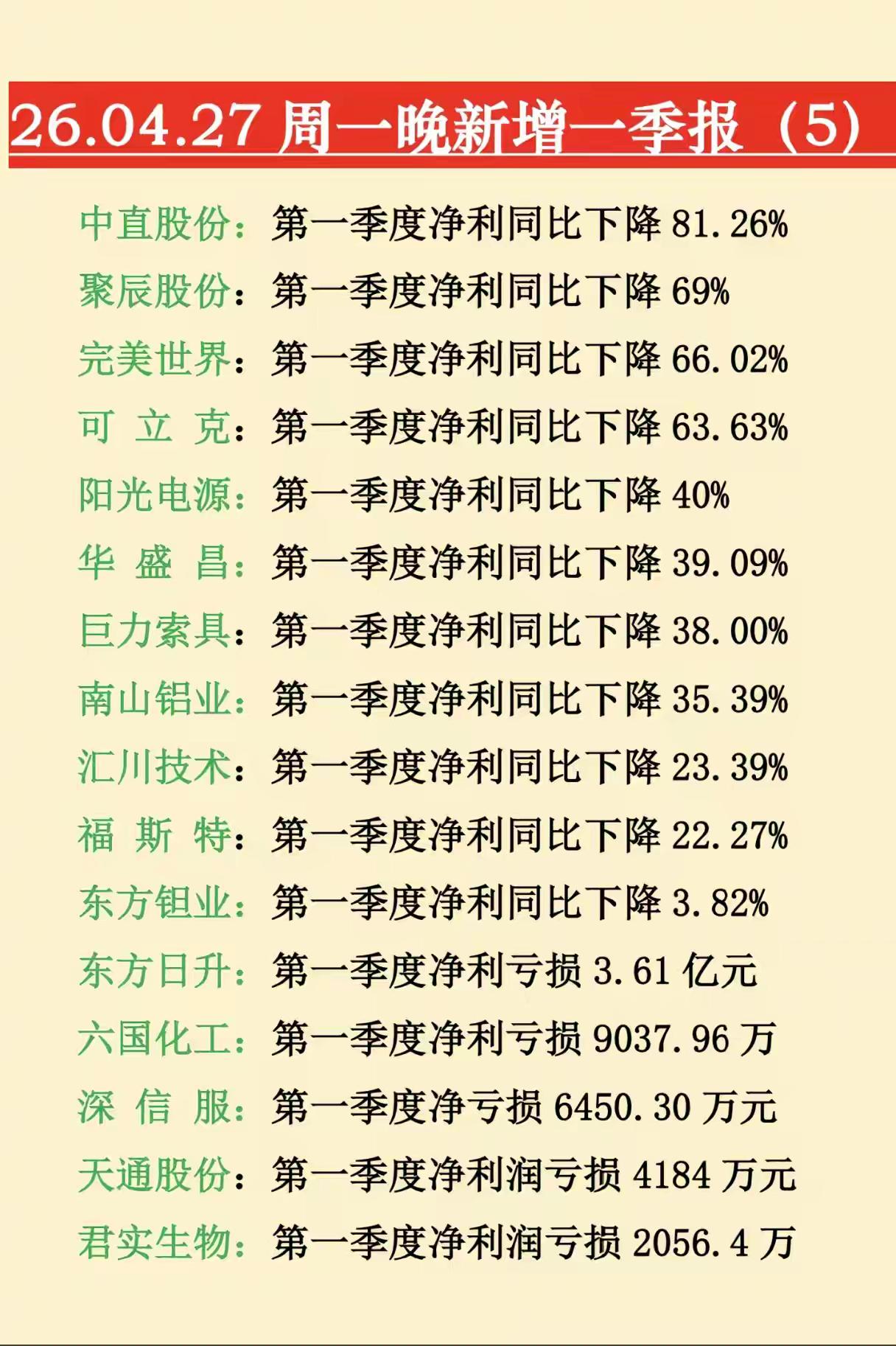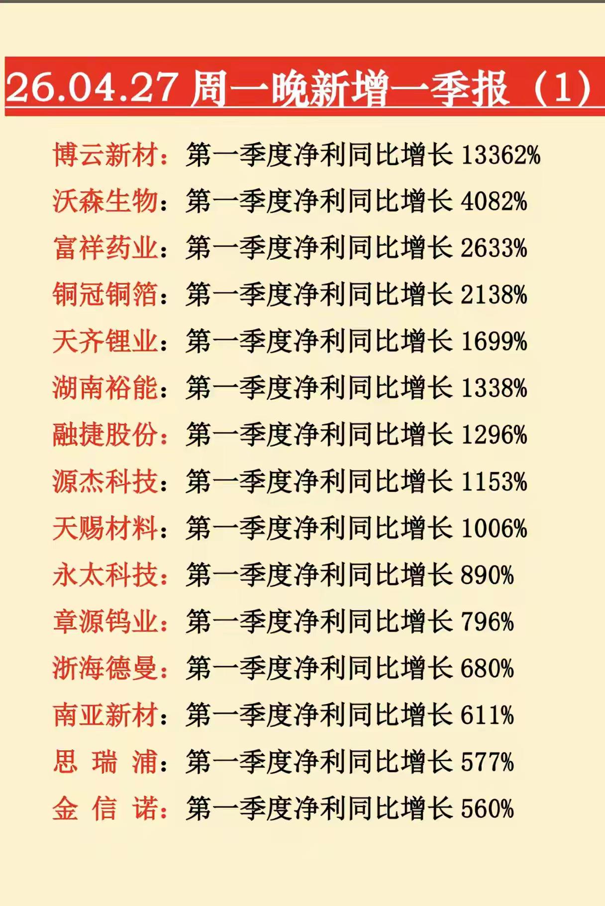 2026年4月27日(周一)晚间新增一季报业绩汇总 一、净利润同比大幅增长(含扭亏) - 博云新材:一季度净利润同比增长13362% - 沃森生物:一季度净利润同比增长4082% - 富祥药业:一季度净利润同比增长2633% - 铜冠铜箔:一季度净利润同比增长2138% - 天齐锂业:一季度净利润同比增长1699% - 湖南裕能:一季度净利润同比增长1338% - 融捷股份:一季度净利润同比增长1296% - 源杰科技:一季度净利润同比增长1153% - 天赐材料:一季度净利润同比增长1006% - 永太科技:一季度净利润同比增长890% - 章源钨业:一季度净利润同比增长796% - 浙海德曼:一季度净利润同比增长680% - 南亚新材:一季度净利润同比增长611% - 思瑞浦:一季度净利润同比增长577% - 金信诺:一季度净利润同比增长560% - 湖南白银:一季度净利润同比增长456% - 宁波富邦:一季度净利润同比增长450.49% - 国际复材:一季度净利润同比增长412.94% - 协创数据:一季度净利润同比增长343.45% - 松发股份:一季度净利润同比增长330% - 剑桥科技:一季度净利润同比增长276% - 宝鼎科技:一季度净利润同比增长268% - 罗曼股份:一季度净利润同比增长222.75% - 恒工精密:一季度净利润同比增长211% - 巨人网络:一季度净利润同比增长211% - 中远海能:一季度净利润同比增长207% - 方正科技:一季度净利润同比增长195% - 紫光国微:一季度净利润同比增长180% - 埃科光电:一季度净利润同比增长169.09% - 永兴材料:一季度净利润同比增长155% - 东山精密:一季度净利润同比增长143% - 纳微科技:一季度净利润同比增长133.22% - 汉马科技:一季度净利润同比增长130.84% - 大金重工:一季度净利润同比增长88.19% - 华海诚科:一季度净利润同比增长87.65% - 中电港:一季度净利润同比增长87.38% - 中航机载:一季度净利润同比增长78.48% - 鼎龙股份:一季度净利润同比增长77.99% - ST臻镭:一季度净利润同比增长76.17% - 宁波建工:一季度净利润同比增长76.72% - 锡业股份:一季度净利润同比增长73.71% - 澜起科技:一季度净利润同比增长61.30% - 三七互娱:一季度净利润同比增长59.02% - 华鲁恒升:一季度净利润同比增长57.96% - 孩子王:一季度净利润同比增长56.79% - 招商南油:一季度净利润同比增长51.73% - 春秋电子:一季度净利润同比增长50.69% - 金诚信:一季度净利润同比增长42.55% - 传音控股:一季度净利润同比增长42.90% - 湖北宜化:一季度净利润同比增长36.19% - 浙商证券:一季度净利润同比增长35.20% - 德科立:一季度净利润同比增长35.08% - 雪龙集团:一季度净利润同比增长31.95% - 药明康德:一季度净利润同比增长26.68% - 优迅股份:一季度净利润同比增长20.04% - 白银有色:一季度净利润1.5亿元,同比扭亏 - 航天彩虹:一季度净利润1亿元,同比扭亏 二、净利润同比下降(含亏损) - 保利发展:一季度净利润同比下降57.06% - 玲珑轮胎:一季度净利润同比下降95.04% - 道道全:一季度净利润同比下降86.25% - 晶瑞电材:一季度净利润同比下降84.62% - 晶盛机电:一季度净利润同比下降82.10% - 中直股份:一季度净利润同比下降81.26% - 聚辰股份:一季度净利润同比下降69% - 完美世界:一季度净利润同比下降66.02% - 可立克:一季度净利润同比下降63.63% - 阳光电源:一季度净利润同比下降40% - 华盛昌:一季度净利润同比下降39.09% - 巨力索具:一季度净利润同比下降38.00% - 南山铝业:一季度净利润同比下降35.39% - 汇川技术:一季度净利润同比下降23.39% - 福斯特:一季度净利润同比下降22.27% - 东方钽业:一季度净利润同比下降3.82% - 东方日升:一季度净利润亏损3.61亿元 - 六国化工:一季度净利润亏损9037.96万元 - 深信服:一季度净利润亏损6450.30万元 - 天通股份:一季度净利润亏损4184万元 - 君实生物:一季度净利润亏损2056.4万元 (注:以上数据基于2026年4月27日周一晚间披露的“新增一季报”整理,覆盖5组名单的全部企业。)