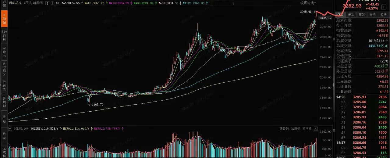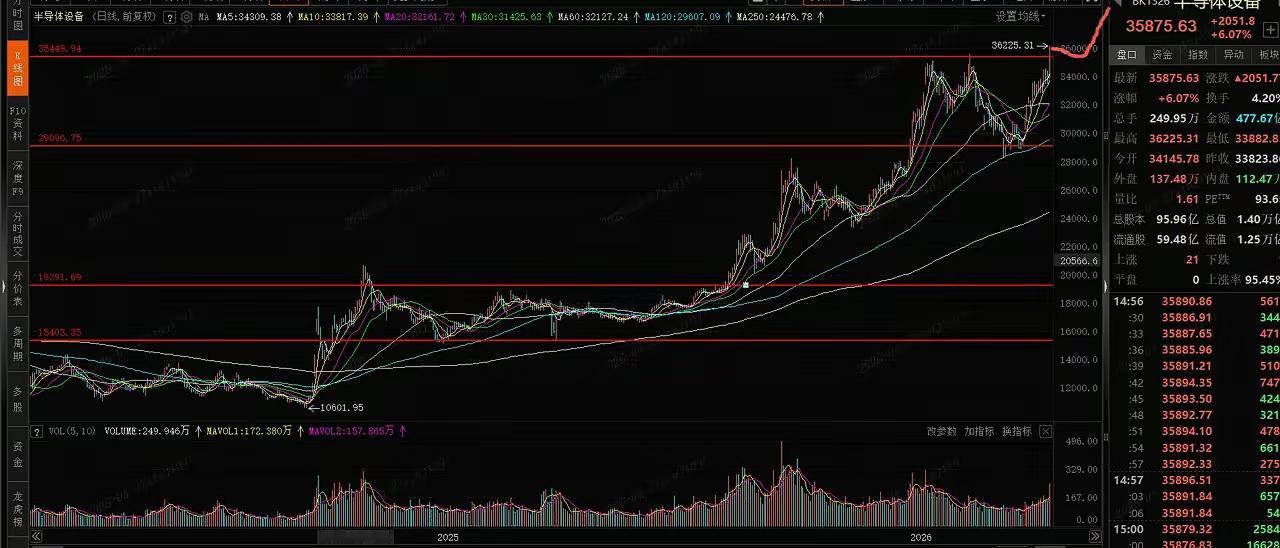 半导体今天这波涨得是真猛,全线飘红,设备板块直接冲了6%,还把前期高点给破了。说到底,还是沾了美股的光,周五晚上那边半导体就爆了,咱们这边今天顺势跟上,加上涨价的利好实实在在,下半年大概率还能接着涨,这波AI上游硬科技的抱团行情,看样子没那么快结束。 你看CPO、通讯设备、半导体、PCB这些,最近就跟绑在一块似的,一荣俱荣。反观白酒,今天又跌了2.3%,真是应了那句“强者恒强,弱者恒弱”。手里握着科技股的估计偷着乐,拿着消费股的怕是得捏把汗。 拆开技术面看看,心里更有数—— 先说半导体设备,今天这根大阳线带着量能突破前高,是真突破,不是虚晃一枪。接下来怎么走?要么接着放量猛涨,要么横盘震荡等五天线跟上来。说实话,第二种更让人踏实,震荡久点,没上车的才有机会,行情走得慢,反而能走得远。这板块我几乎天天提,不是没道理,硬逻辑摆在那。 半导体板块离前高就差一步,这坎肯定能过去。突破之后,大概率也会走震荡,跟设备板块类似。这种横盘不是坏事,是在给后面蓄力,就像跑步前先喘口气,才能跑得更久。 科创综指更厉害,今天一根中阳线直接创了历史新高,上面没套牢盘了,涨起来没负担。它的量能是阶梯式放大,不是一下子爆量,这种节奏更稳,只要还在五天线之上,就接着看涨。 科创芯片基本跟着半导体设备走,道理都一样,就不多说了。 不过得提醒一句,第一阶段行情涨成这样,离阶段性结束不远了。要是有第二波,估计得等5月下半月。突破现在这个箱体后震荡两周左右,再冲一波的概率很大。 有人可能觉得现在追太高,其实震荡的时候就是机会。就像菜市场抢新鲜菜,刚上架就哄抢容易买贵,等摊位前稍微松点,再挑拣着买,既划算又踏实。 这波硬科技行情,跟去年新能源不一样,有实实在在的需求撑着。AI算力往上冲,半导体作为上游,订单根本不愁。身边做电子元件的朋友说,他们工厂最近都在加夜班,交货期排到下个月了,这种景气度不是炒概念能比的。 反观白酒,不是说不好,只是资金就这么多,这边抢得多了,那边自然就少了。市场永远在找性价比高的地方,现在科技股的性价比,明显比消费股更被资金认可。 手里有半导体相关持仓的,不用急着卖,趋势没坏就拿着。没上车的也别慌,等震荡的时候再看,别追在最高点。投资这事儿,比的不是谁下手快,是谁看得准、拿得住。 最后说句实在的,硬科技的行情一旦起来,不会三五天就结束,但中间肯定有颠簸。能扛住震荡,才能吃到后面的肉。你觉得这波半导体能冲到哪?