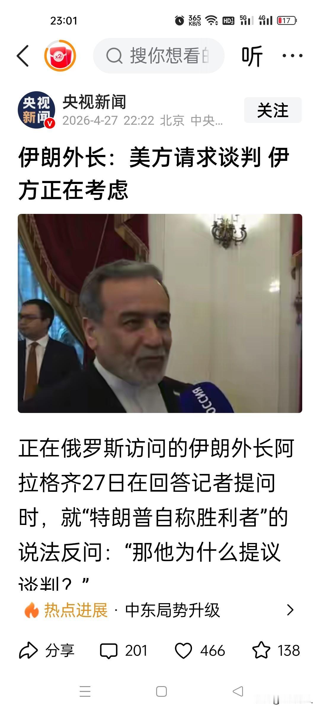 就在刚刚,在俄罗斯访问的伊朗外长:美方请求谈判,伊方正在考虑。 4月27日,正在俄罗斯进行访问的伊朗外长阿拉格齐,面对记者的层层追问,谈及特朗普对外高调宣称“自己是美伊对抗的胜利者”这一说法,阿拉格齐当场抛出一句直击灵魂的反问:“那他为什么提议谈判?” “那他为什么提议谈判?”,这个问题,恰恰问到了美伊博弈的根上,戳破了美国最不愿承认的真相。从古至今,真正的胜利者,从不需要坐下来谈判。 胜利者拥有绝对的主导权,拥有碾压式的实力,只需要站在制高点下达命令,让对手俯首听命即可,根本没必要耗费精力,与对手进行所谓的平等协商。 一边对外大肆宣扬自己大获全胜,一边又放下身段,主动找上门请求谈判,这种自相矛盾的做法,根本不是胜利者的姿态,反而彻底暴露了美国的心虚与慌乱。 细数美国这些年在中东的所作所为,一场接一场的战争接连打响,从挥师入侵伊拉克,到深陷阿富汗战争泥潭,再到插手叙利亚局势、频频对伊朗极限施压,几十年穷兵黩武,耗费了无数财力、军力,可最终又得到了什么? 当初信誓旦旦想要掌控的伊拉克石油资源,如今并未尽数落入美国手中;觊觎已久的阿富汗各类矿产,也没能成为美国的囊中之物;费尽心思想要操控的叙利亚局势,始终没能按照美国的意愿推进 对伊朗围追堵截数年,非但没有压垮这个中东国家,反而让伊朗愈发坚韧。在中东折腾了数十年,美国想要的利益、想要的霸权掌控,到头来几乎一无所获,这样的结果,凭什么敢大言不惭地说自己是胜利者? 如今的美国,在中东的军事部署早已走到强弩之末,各项军事资源都濒临极限,早已没有了继续强硬对抗的底气。常年在中东部署的航母编队,急需返港维修保养。 频繁执行任务的各类战机,设备老化、维护压力剧增;长期驻守海外的士兵,身心俱疲,亟待轮换休整。在中东持续对峙的这一年时间里,美军的弹药储备不断消耗,军火库早已接近见底,后续补给难以为继。 更让美国头疼的是,原本在中东追随自己的盟友,如今纷纷看清形势,逐渐与美国拉开距离,甚至开始寻求独立的外交路线,美国的中东盟友体系近乎分崩离析。 与此同时,美国国内反战声浪一浪高过一浪,民众早已厌倦了无休止的对外战争,对政府耗费大量国力在海外挑起对抗的做法愈发不满,国内舆论压力早已让政府难以招架。 内忧外患交织之下,美国除了主动提出谈判,根本没有第二条路可选。说白了,此刻的美国,早已不奢求在美伊对抗中拿到真正的胜利,只是迫切需要一个台阶,一个足够体面、能在国际上不丢脸、更能让国内选民勉强接受的台阶。 而这个台阶,就是“与伊朗重启谈判”。只要伊朗愿意松口,答应坐下来谈判,美国就能立刻对外造势,宣称“通过外交手段成功化解中东危机”,至于谈判的具体内容、最终能达成什么成果,对美国来说根本不重要。 重要的是“启动谈判”这个动作,只要做出了这个姿态,就能保住自己的霸权面子,而保住了面子,就能安抚国内选民,保住至关重要的选票。 特朗普政府此刻打的算盘,再清楚不过:他想要的从来不是伊朗彻底服软、无条件投降,而是为拿到一份能糊弄选民的外交成绩单。 在11月中期选举竞选的关键节点来临之前,不需要任何实质性的军事胜利,只要有“美伊重启对话”这一看似体面的结果,就足够迎合国内民众的厌战情绪。 面对美国的主动求和,伊朗外长一句“我们正在考虑”,堪称外交上的神来之笔。没有直接同意,也没有明确拒绝,一个“考虑”,尽显外交智慧,更直接点明了当下博弈的主动权归属:美国急不可耐,伊朗从容淡定。 越是沉得住气、愿意等待的一方,手里就握有越多的主动权。伊朗的态度很明确:你想谈判,我不会刻意阻拦,但想要谈,就得拿出足够的诚意,拿出有分量的筹码,我要先看看你有多少诚意、有多少底牌,再决定是否要坐上谈判桌。 接下来美伊之间的博弈走向,其实早已注定。谈判终究会启动,但节奏绝不会由美国掌控,只会按照伊朗的步调慢慢推进。伊朗必然会拉长谈判战线、扩大谈判议题、抬高谈判条件,一步步试探美国的底线。 美国能接受便谈,接受不了,就只能重回对峙状态,可如今的美国早已打不动、耗不起,最终还是只能回到谈判桌前妥协。这样来回拉锯之下,美国会无奈发现,自己折腾了一圈,最终又回到了原点。 这个原点,就是伊朗依旧牢牢掌握着自身发展的主动权,美国依旧没能实现自己的霸权目的,中东局势依旧没有按照美国的意愿改变。 表面上看,这场博弈似乎是不分胜负,但真正的赢家,早已是伊朗。因为伊朗用自己的坚守,向全世界证明:美国并非不可战胜,所谓的霸权强权,终究抵不过正义与坚守,而这个道理,远比任何一纸谈判协议,都更有价值、更有力量。 消息来源@央视新闻