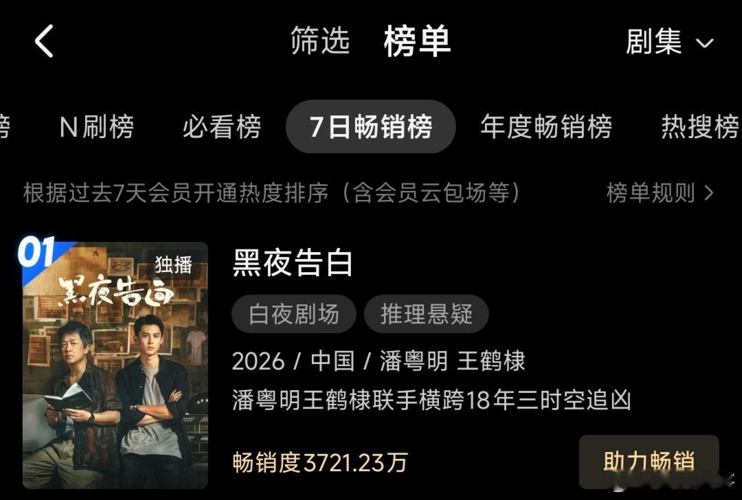 王鹤棣的黑夜告白优酷站内热度破8000了,并且已登顶七日畅销榜,我已看到第4集,看得非常爽!