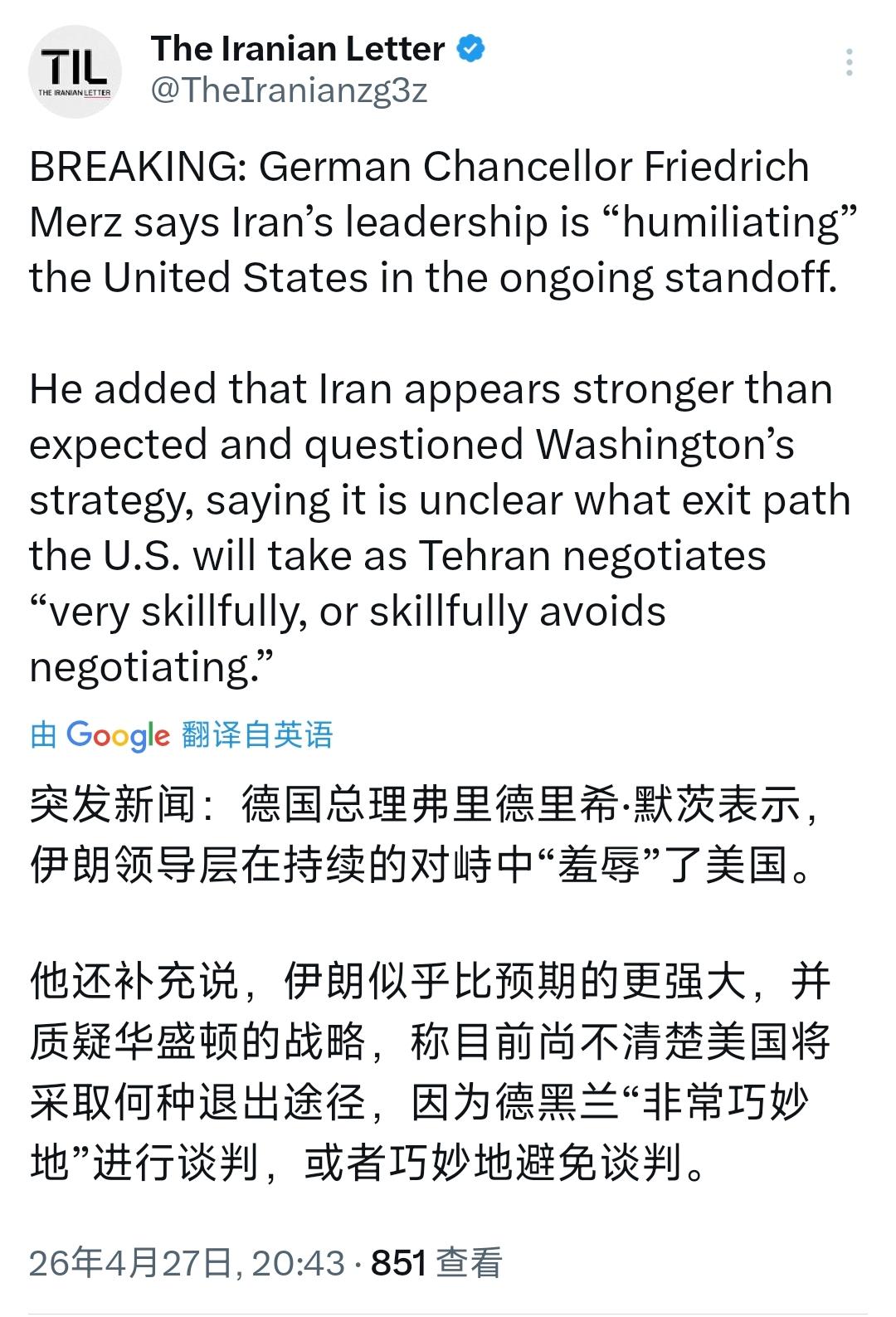 突发新闻:德国总理默茨表示,伊朗领导层在持续的对峙中“羞辱”了美国。 他还补充说,伊朗似乎比预期的更强大,并质疑华盛顿的战略,称目前尚不清楚美国将采取何种退出途径,因为德黑兰“非常巧妙地”进行谈判,或者巧妙地避免谈判。 [机智]评几句:伊朗用“拖字诀”把美国晾在了战略死胡同。德黑兰确实“羞辱”了华盛顿——它既不打全面战争给美军动武借口,也不乖乖谈判送上门被宰,而是利用关键地缘枢纽和能源杠杆,把超级大国耗在了成本最高、收益为零的泥潭里。特朗普政府现在就是骑虎难下:撤军等于承认制裁失效、霸权颜面扫地;不撤,就得继续在霍尔木兹海峡烧钱当“纸老虎”。默茨的潜台词是,美国又一次重蹈了阿富汗式的覆辙——只有冲进去的冲动,没有爬出来的退路。