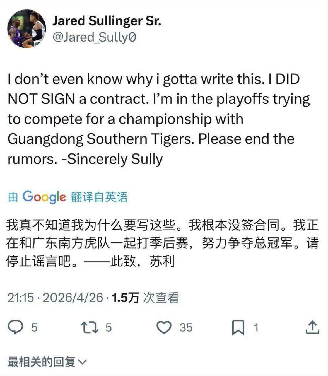 大意是,之前网上传播关于他在海外联赛签约和转会情况是假的,他没有签合同(应该是指波多黎各联赛)他现在正在跟宏远一起打季后赛,努力争夺总冠军,请停止谣言。
