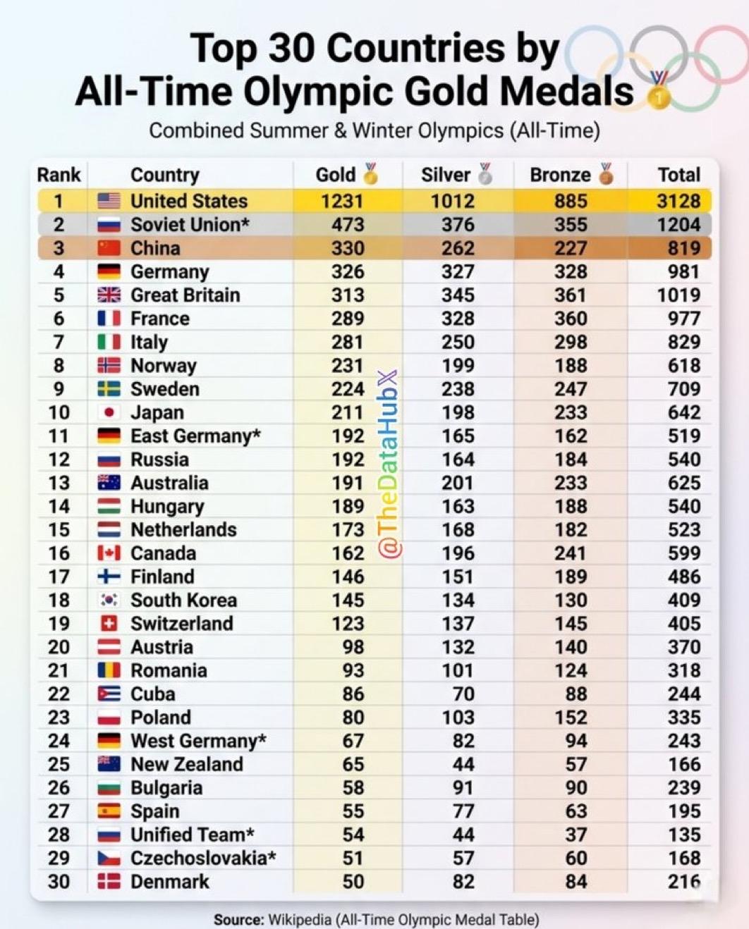 奥运史上获得金牌最多排名前30的国家: 1)🇺🇸美国-1231 2)🇷🇺苏联-473 3)🇨🇳中国-330(没包括香港,澳门与台湾) 4) 🇩🇪 德国 - 326 5) 🇬🇧 英国 - 313 6) 🇫🇷 法国 - 289 7)🇮🇹意大利-281 8) 🇳🇴 挪威 - 231 9)🇸🇪瑞典-224 10)🇯🇵日本-211 11)🇩🇪东德-192 12)🇷🇺俄罗斯-192 13)🇦🇺澳大利亚-191 14)🇭🇺匈牙利-189 15)🇳🇱荷兰 - 173 16)🇨🇦加拿大-162 17)🇫🇮芬兰-146 18)🇰🇷韩国-145 19) 🇨🇭 瑞士 - 123 20) 🇦🇹 奥地利 - 98 21) 🇷🇴 罗马尼亚 - 93 22) 🇨🇺 古巴 - 86 23)🇵🇱波兰-80 24)🇩🇪西德-67 25) 🇳🇿 新西兰 - 65 26) 🇧🇬 保加利亚 - 58 27)🇪🇸西班牙-55 28)🇷🇺南斯拉夫-54 29) 🇨🇿 捷克斯洛伐克-51 30)🇩🇰丹麦-50 注意:苏联、东德、西德、捷克斯洛伐克和南斯拉夫是不再参加奥运会的前国家实体。 他们的奖牌总数与俄罗斯或德国等现代国家不相加。 来源:维基百科(有史以来的奥运会奖牌表)